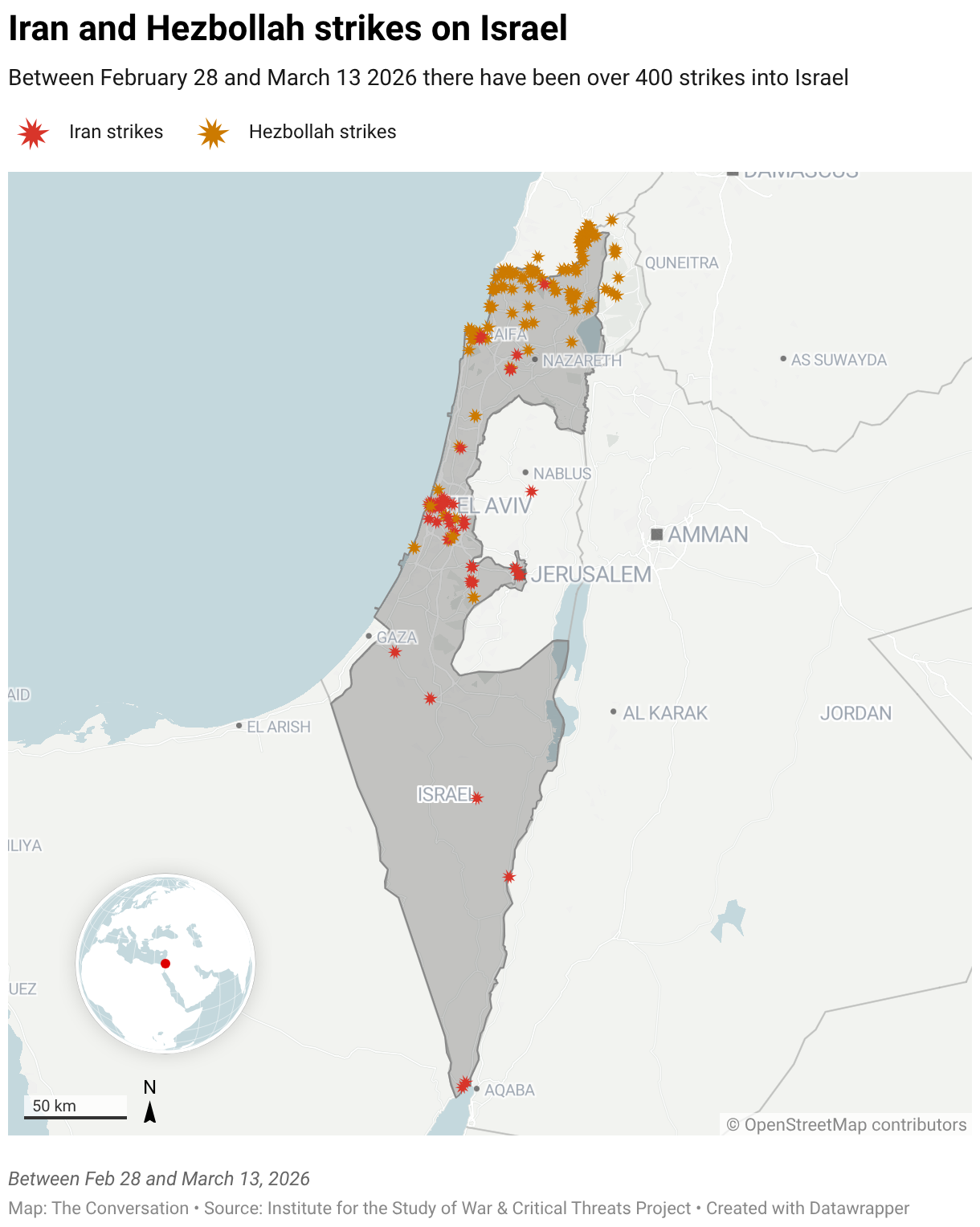 Between February 28 and March 13 2026 there have been over 400 strikes into Israel