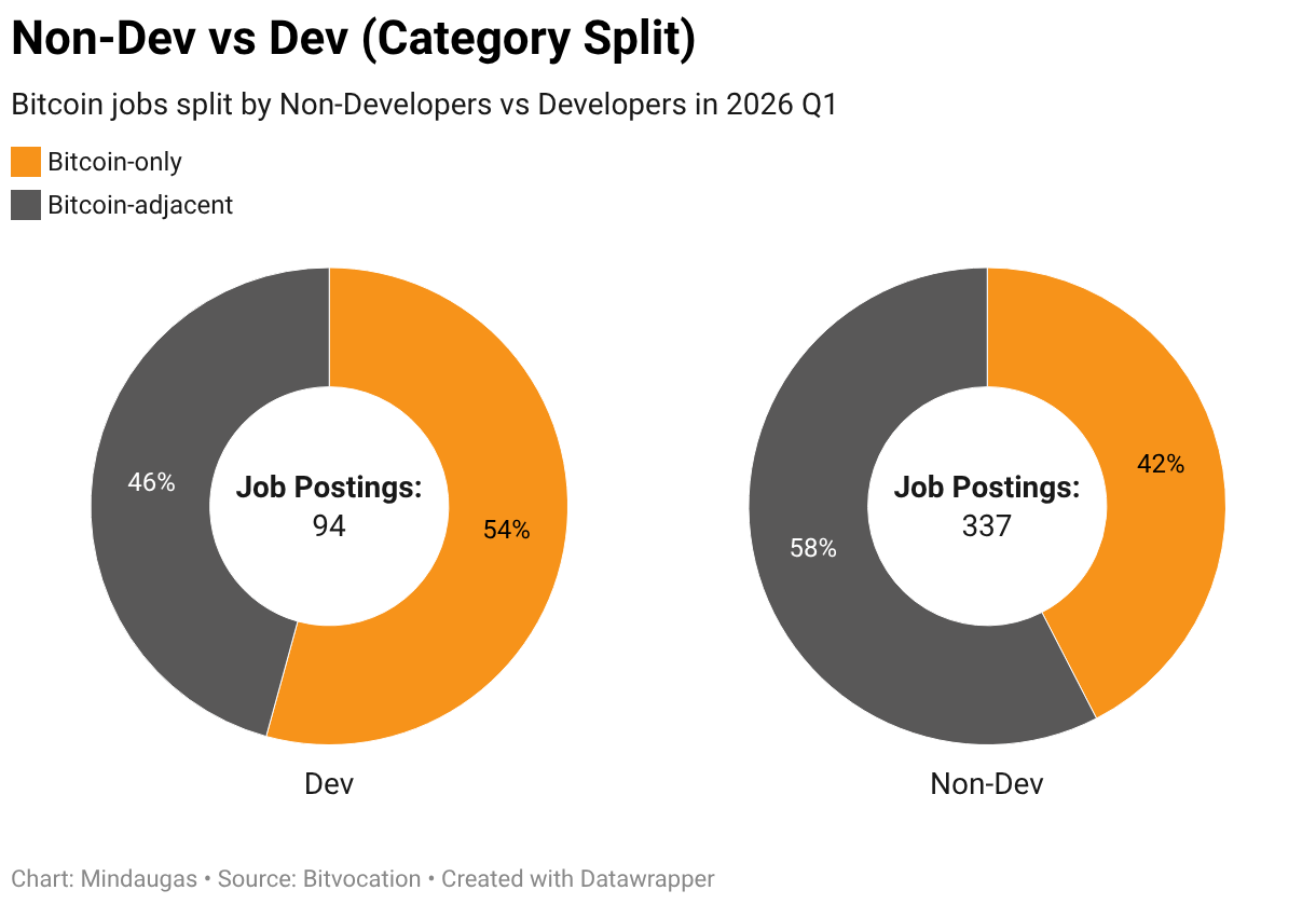 Bitcoin jobs split by Non-Developers vs Developers in 2026 Q1