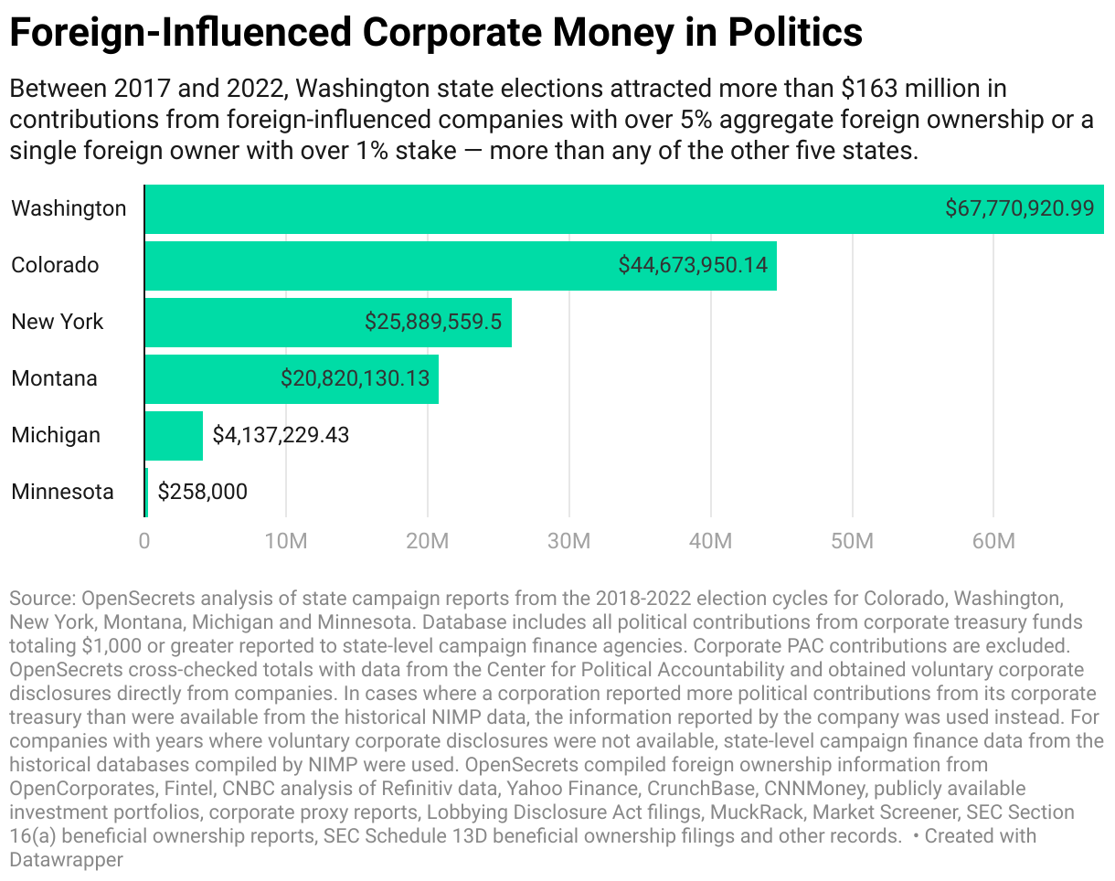 Between 2017 and 2022, Washington state elections attracted more than $163 million in contributions from foreign-influenced companies with over 5% aggregate foreign ownership or a single foreign owner with over 1% stake — more than any of the other five states.