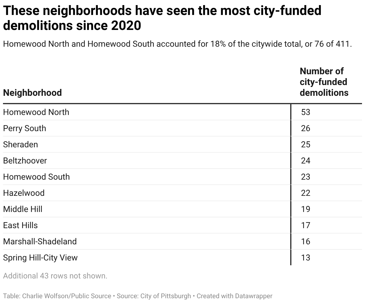 Homewood North and Homewood South accounted for 18% of the citywide total, or 76 of 411.