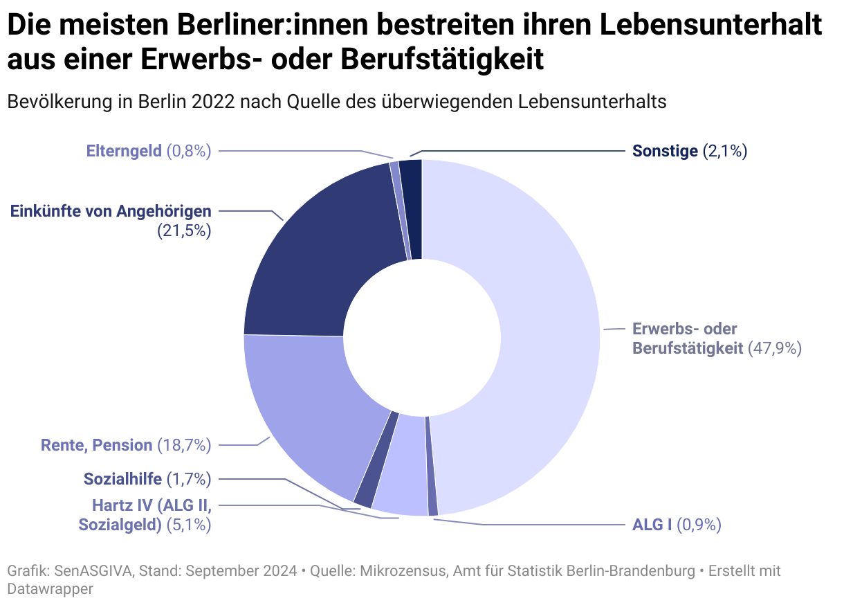 Der überwiegende Teil der Berliner Bevölkerung bestritt seinen Lebensunterhalt 2022 durch Erwerbs- oder Berufstätigkeit (47,9 Prozent). Zwei weitere große Gruppen erhielten Rente/Pension (18,7 Prozent) oder Einkünfte von Angehörigen (21,5 Prozent). Etwa 5,1 Prozent der Berlinerinnen und Berliner erhielten Grundsicherung.