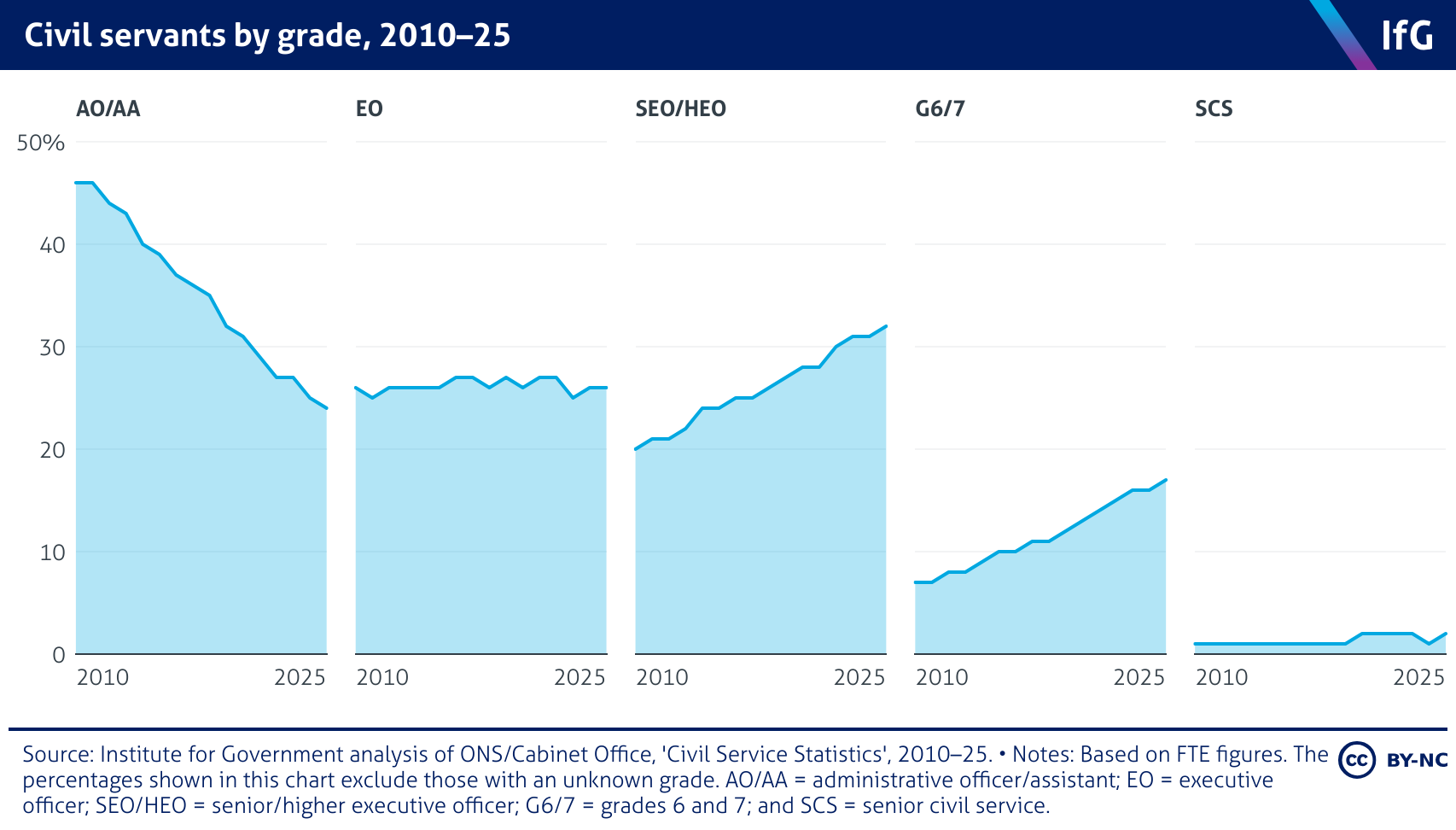 A series of five line charts from the Institute for Government, each representing a grade in the civil service. Each chart shows the proportion of the civil service each grade made up between 2010 and 2024. The most junior AO and AA grades have made up a steadily decreasing proportion of the civil service since 2010, while EOs have held steady, and the more senior SEO/HEO and grade 6s and 7s have been increasing steadily as a proportion of the overall civil service.