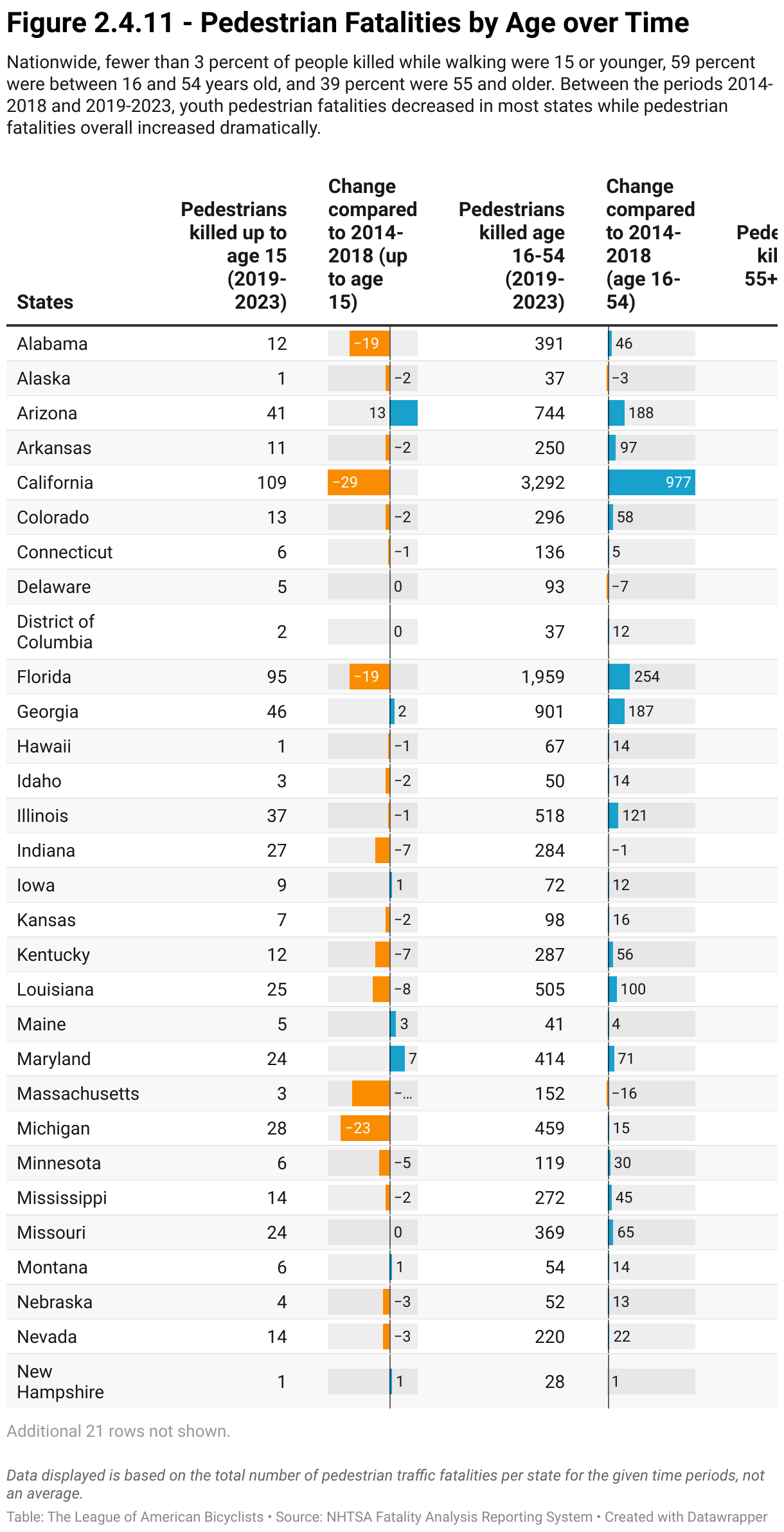 Nationwide, fewer than 3 percent of people killed while walking were 15 or younger, 59 percent were between 16 and 54 years old, and 39 percent were 55 and older. Between the periods 2014-2018 and 2019-2023, youth pedestrian fatalities decreased in most states while pedestrian fatalities overall increased dramatically.