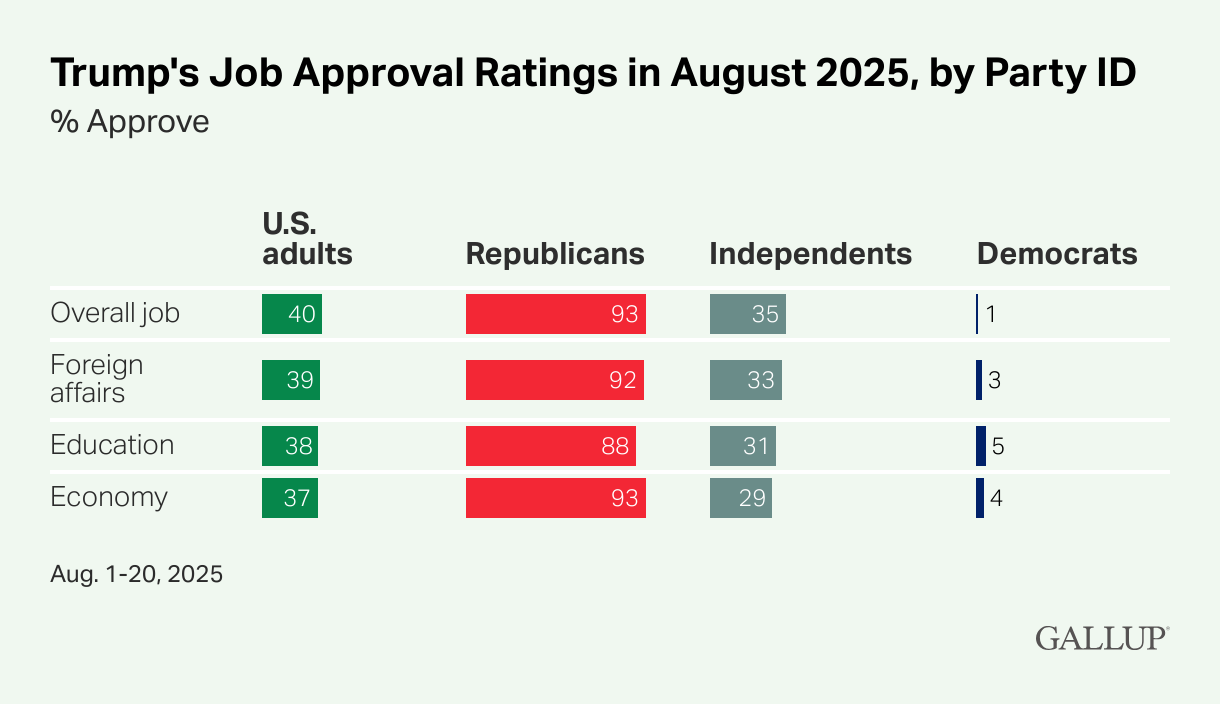 The table displays approval percentages for four policy areas based on partisan affiliation, from Aug. 1 to 20, 2025. Overall job approval among U.S. adults is 40%, with a sharp divide by party: 93% of Republicans approve, compared with 35% of independents and 1% of Democrats. On foreign affairs, 39% of U.S. adults approve, including 92% of Republicans, 33% of independents and 3% of Democrats. Approval on education stands at 38% overall, supported by 88% of Republicans, 31% of independents and 5% of Democrats. On the economy, the overall approval is 37%, with Republicans at 93%, independents at 29% and Democrats at 4%.