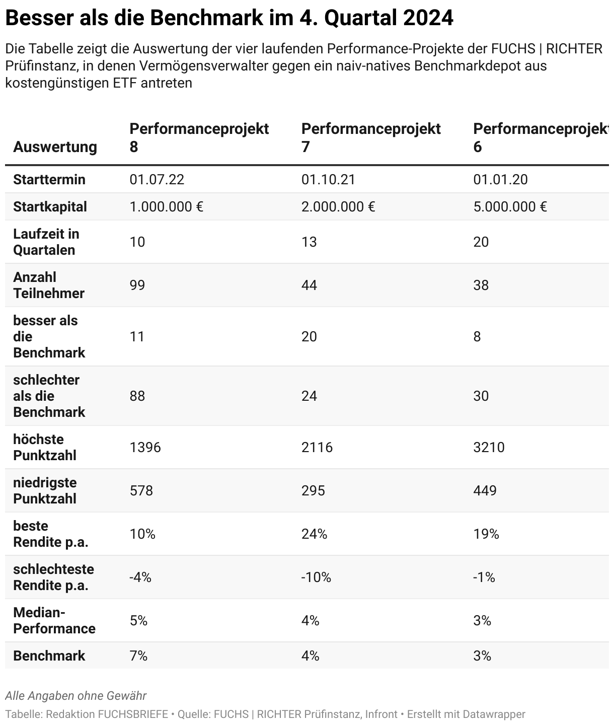 Die Tabelle zeigt die Auswertung der vier laufenden Performance-Projekte der FUCHS | RICHTER Prüfinstanz, in denen Vermögensverwalter gegen ein naiv-natives Benchmarkdepot aus kostengünstigen ETF antreten