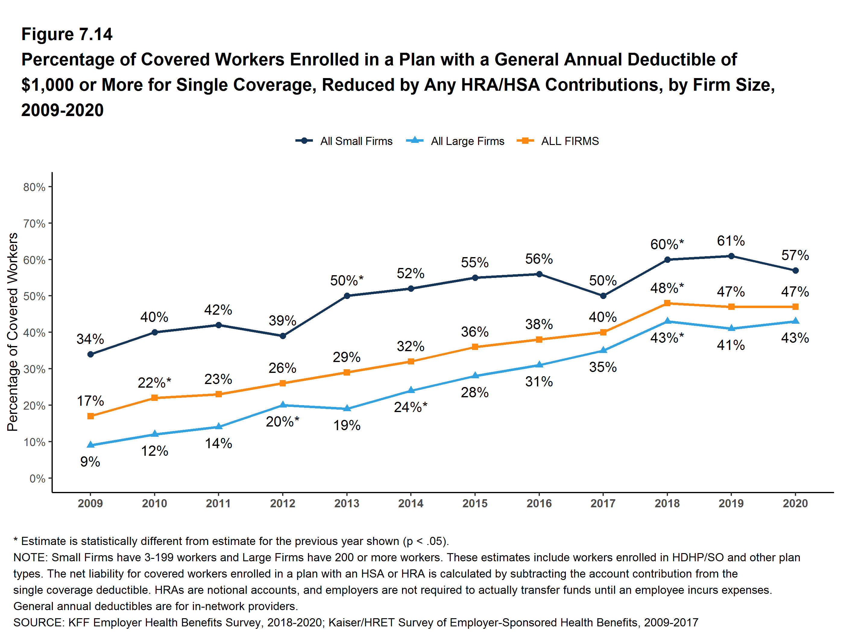 Percentage of covered workers enrolled in a plan with a general annual deductible of $1,000 or more for single coverage, reduced by any HRA/HSA contributions, by firm size, 2009-2020