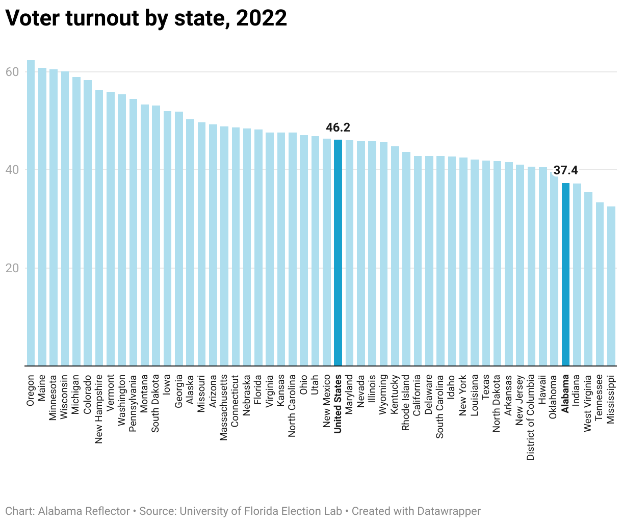 A list of states according to election turnout in 2022. Oregon was first with 62% of the voting age population casting ballots; Mississipi was last with less than 33%. Alabama is near the bottom at 37.4%.