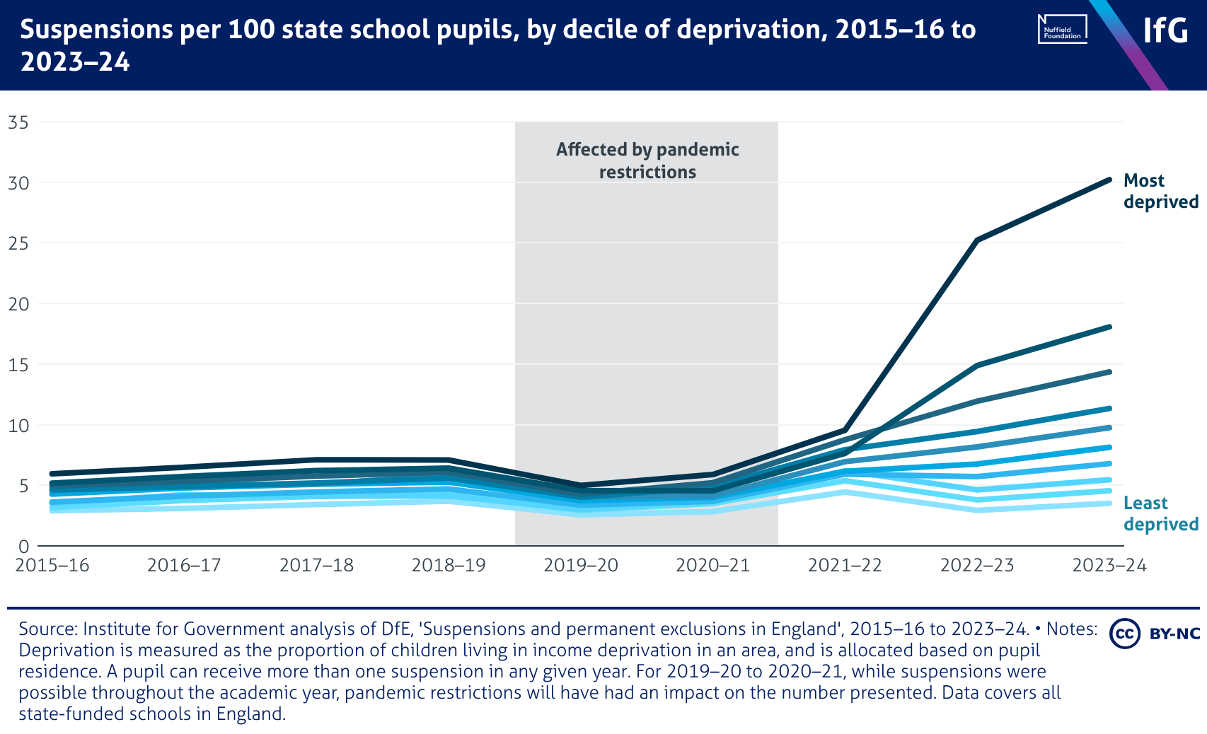 A line chart from the Institute for Government of suspensions per 100 state school pupils, by decile of deprivation, 2015–16 to 2023–24, where the disparity between pupils living in the most and least deprived areas has grown nearly eight times in size since the pandemic. In 2023–24, suspensions were ten times more common among pupils living in the most deprived areas than among those in the least deprived areas, at a rate of 30.2 versus 3.5 per 100.