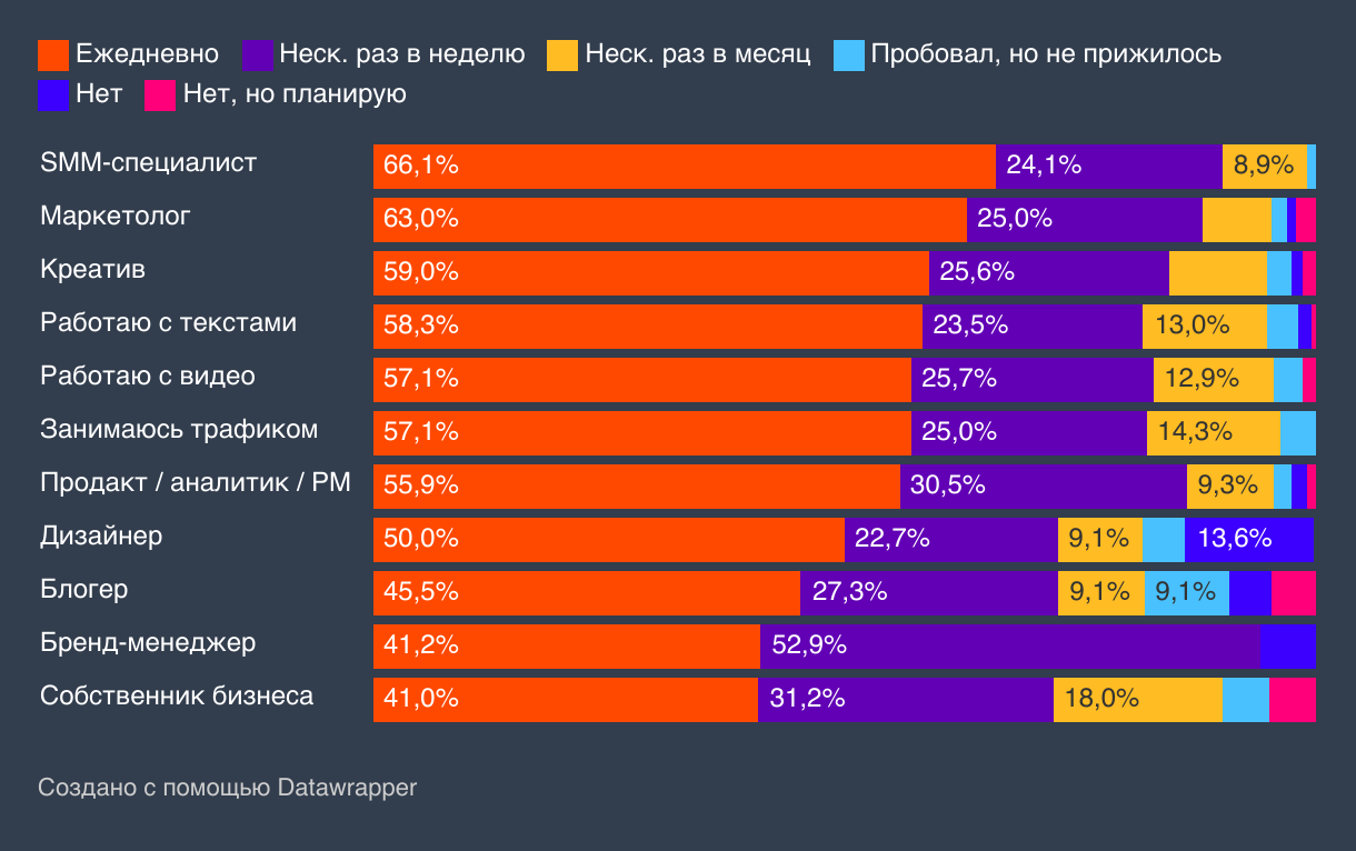 Частота использования нейросетей с разбивкой по профессиям