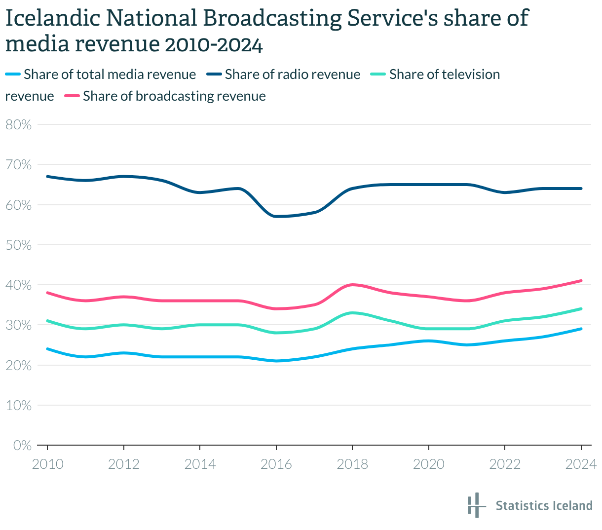 Icelandic National Broadcasting Service's share of media revenue 2010-2024
