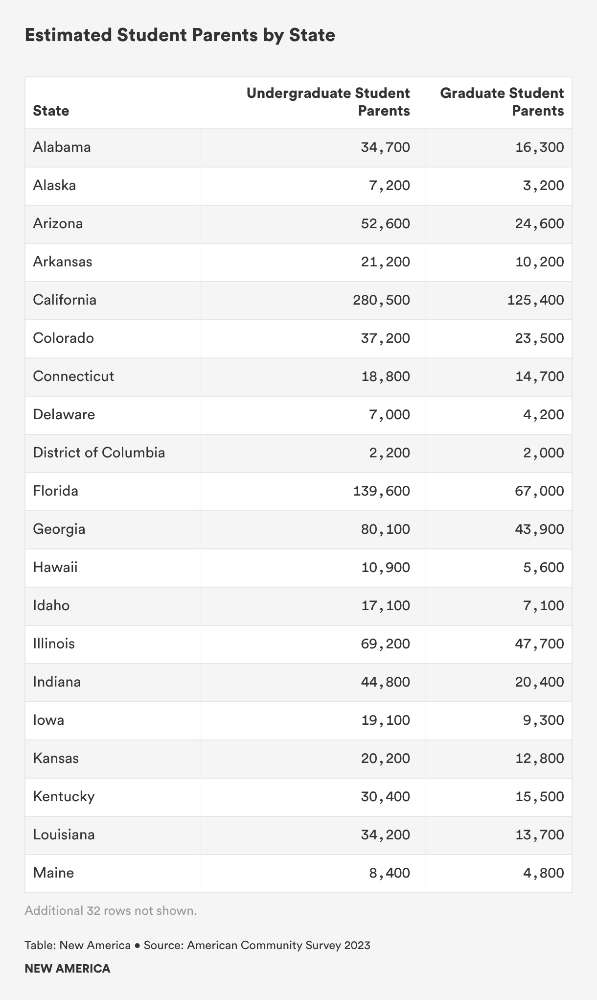 A table with rows for each state, and columns listing estimated number of undergraduate student parents and graduate student parents in that state.