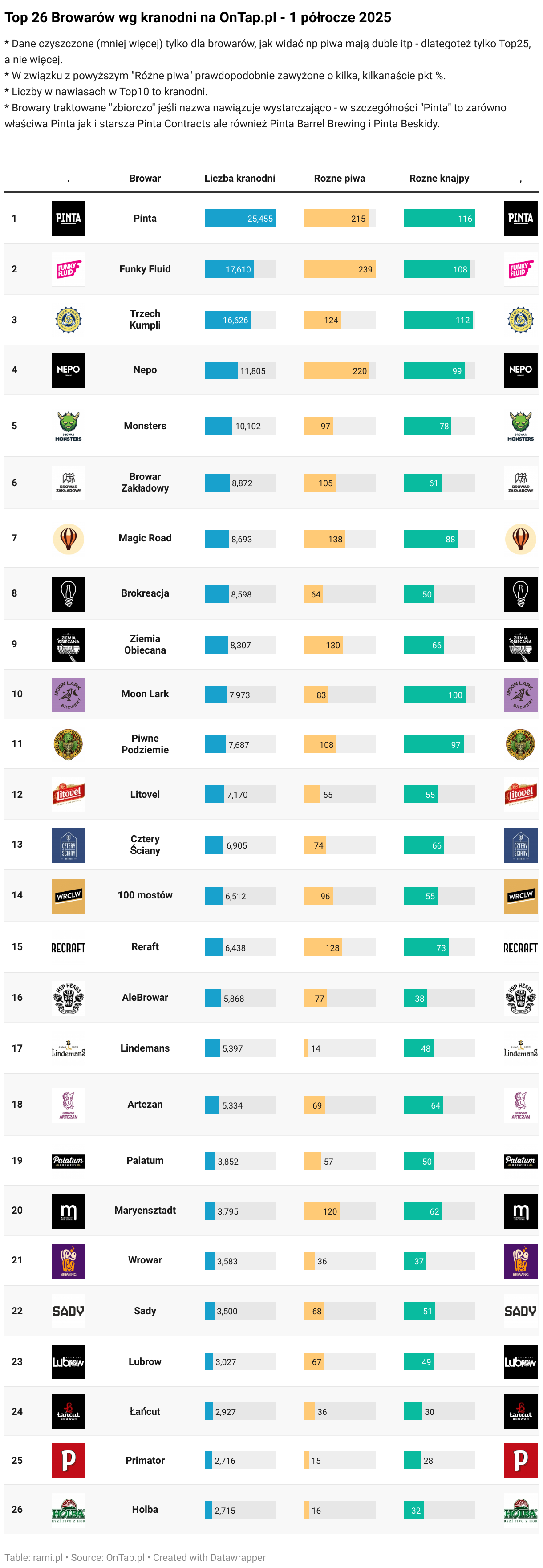 * Browary traktowane "zbiorczo" jeśli nazwa nawiązuje wystarczająco - w szczegółności "Pinta" to zarówno właściwa Pinta jak i starsza Pinta Contracts ale również Pinta Barrel Brewing i Pinta Beskidy.