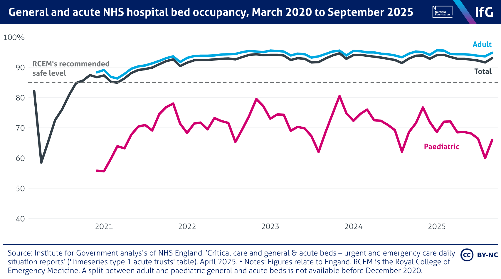 A line chart from the Institute for Government showing general and acute NHS hospital bed occupancy in England from March 2020 to September 2025. After a sharp fall during the pandemic’s first wave, occupancy recovered and has since remained high, averaging around 93%, well above the RCEM’s 85% recommended safe level. Adult occupancy has stayed persistently elevated, while paediatric occupancy has mainly fluctuated between 60–80%, peaking during winter months.
