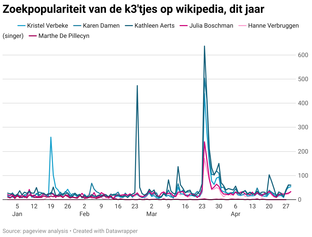 Zoekpopulariteit van de k3'tjes op wikipedia, dit jaar
