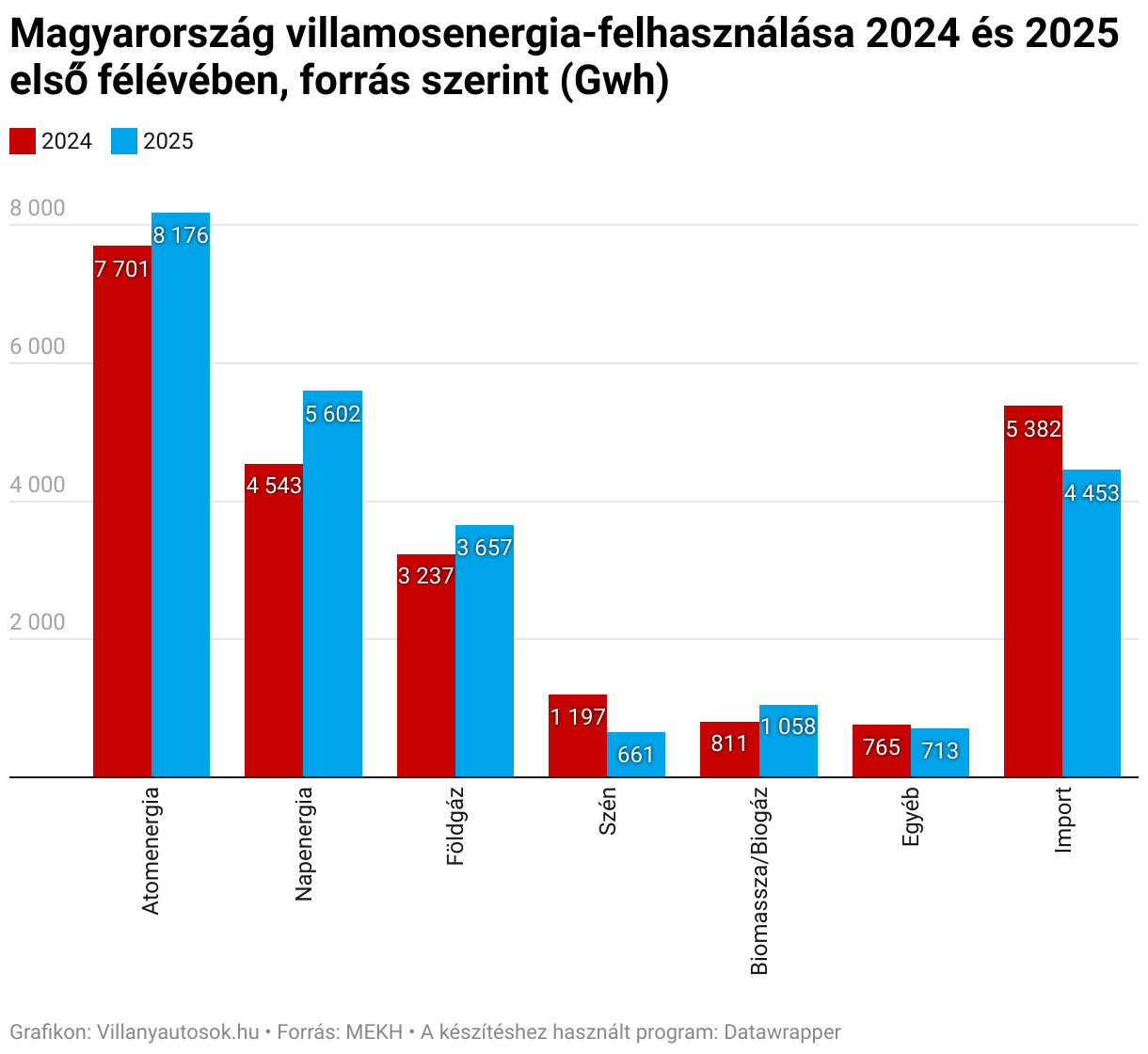 Magyarország villamosenergia-felhasználása 2024 és 2025 első félévében, forrás szerint (Gwh)