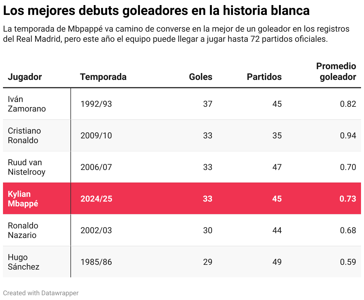 La temporada de Mbpappé va camino de converse en la mejor de un goleador en los registros del Real Madrid, pero este año el equipo puede llegar a jugar hasta 72 partidos oficiales.