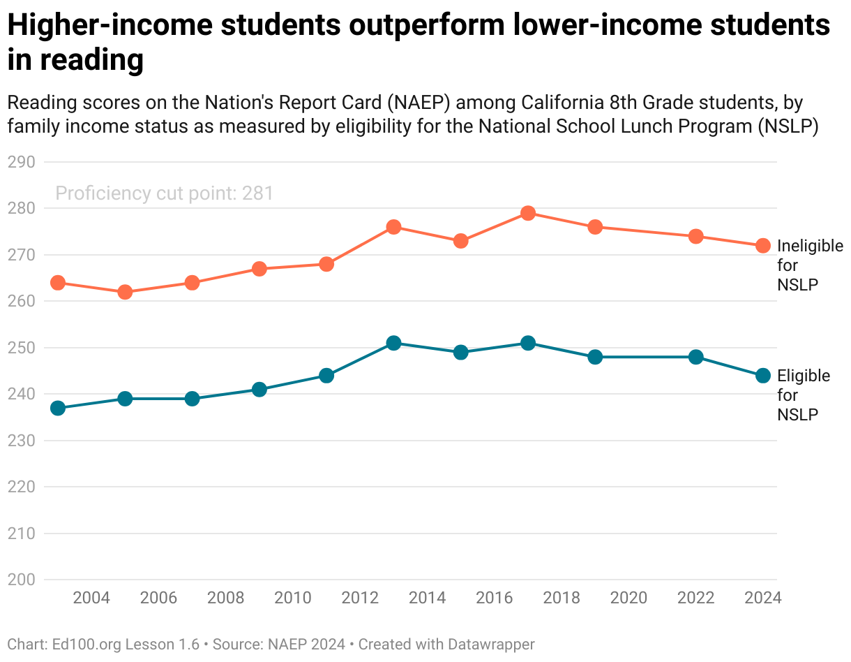 Reading scores on the Nation's Report Card (NAEP) among California 8th Grade students, by family income status as measured by eligibility for the National School Lunch Program (NSLP)
