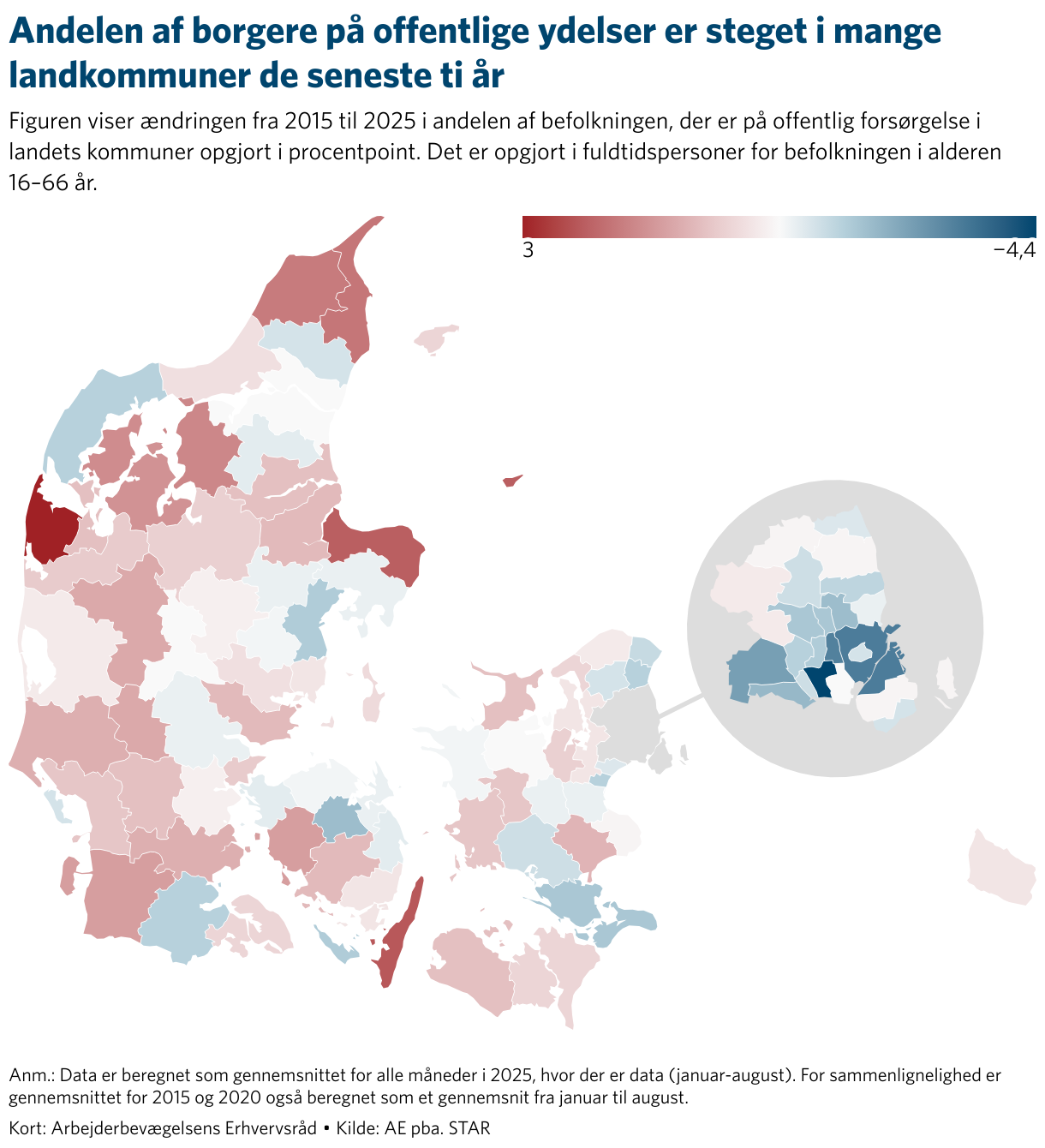 Figuren viser ændringen fra 2015 til 2025 i andelen af befolkningen, der er på offentlig forsørgelse i landets kommuner opgjort i procentpoint. Det er opgjort i fuldtidspersoner for befolkningen i alderen 16–66 år.