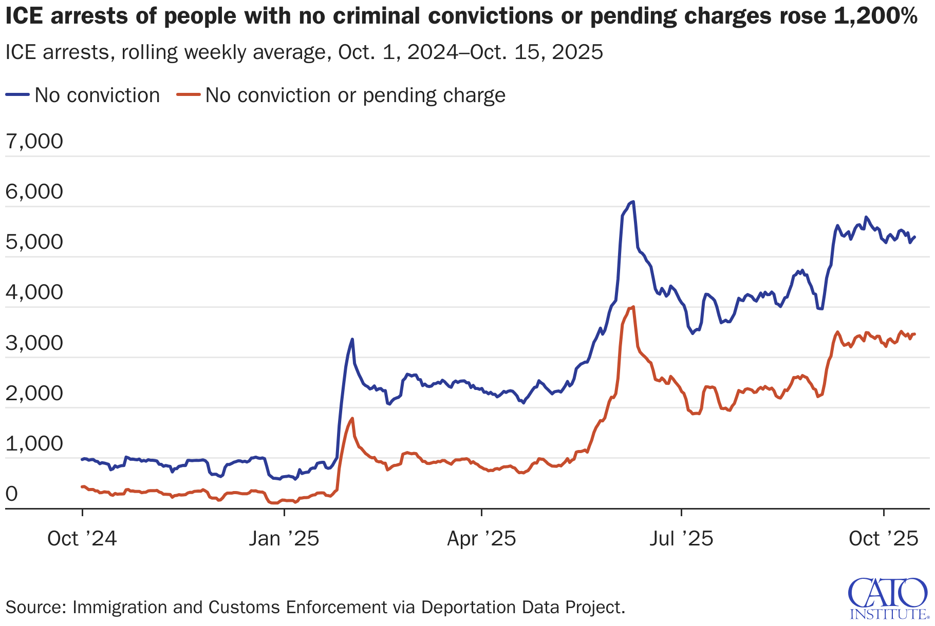 ICE arrests, rolling weekly average, Oct. 1, 2024–Oct. 15, 2025