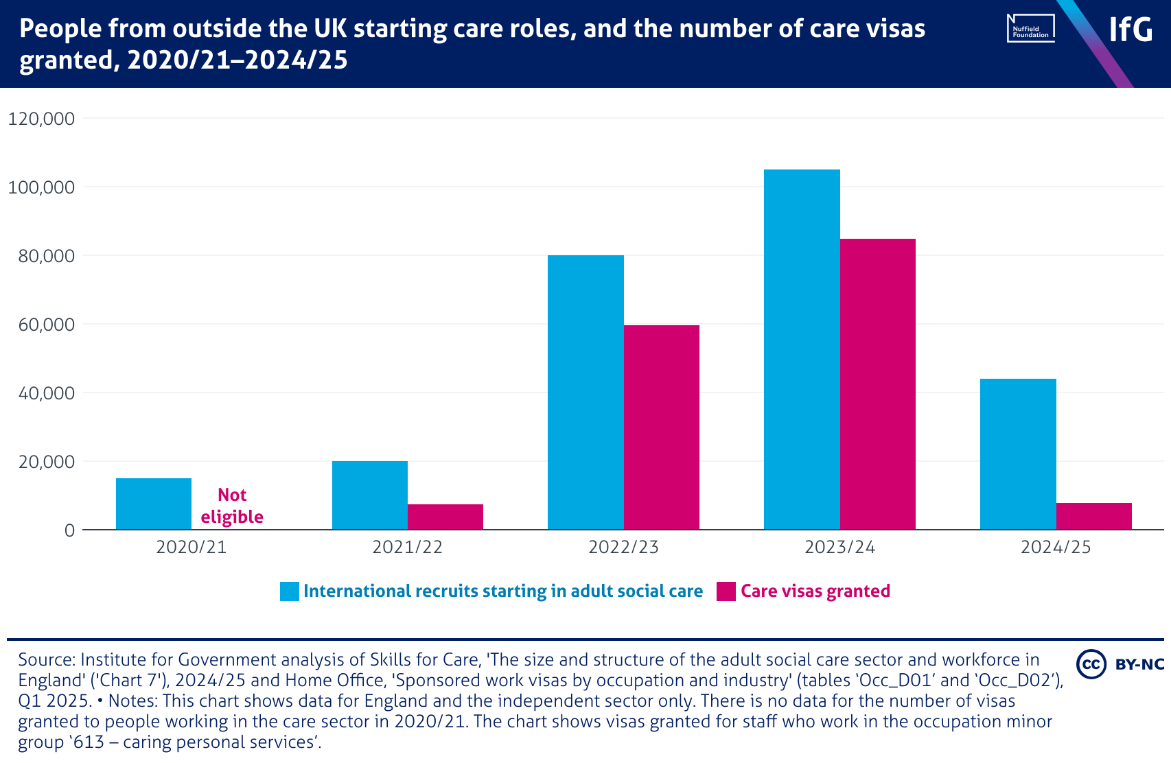 People from outside the UK starting care roles, and the number of care visas granted, 2020/21–2024/25
