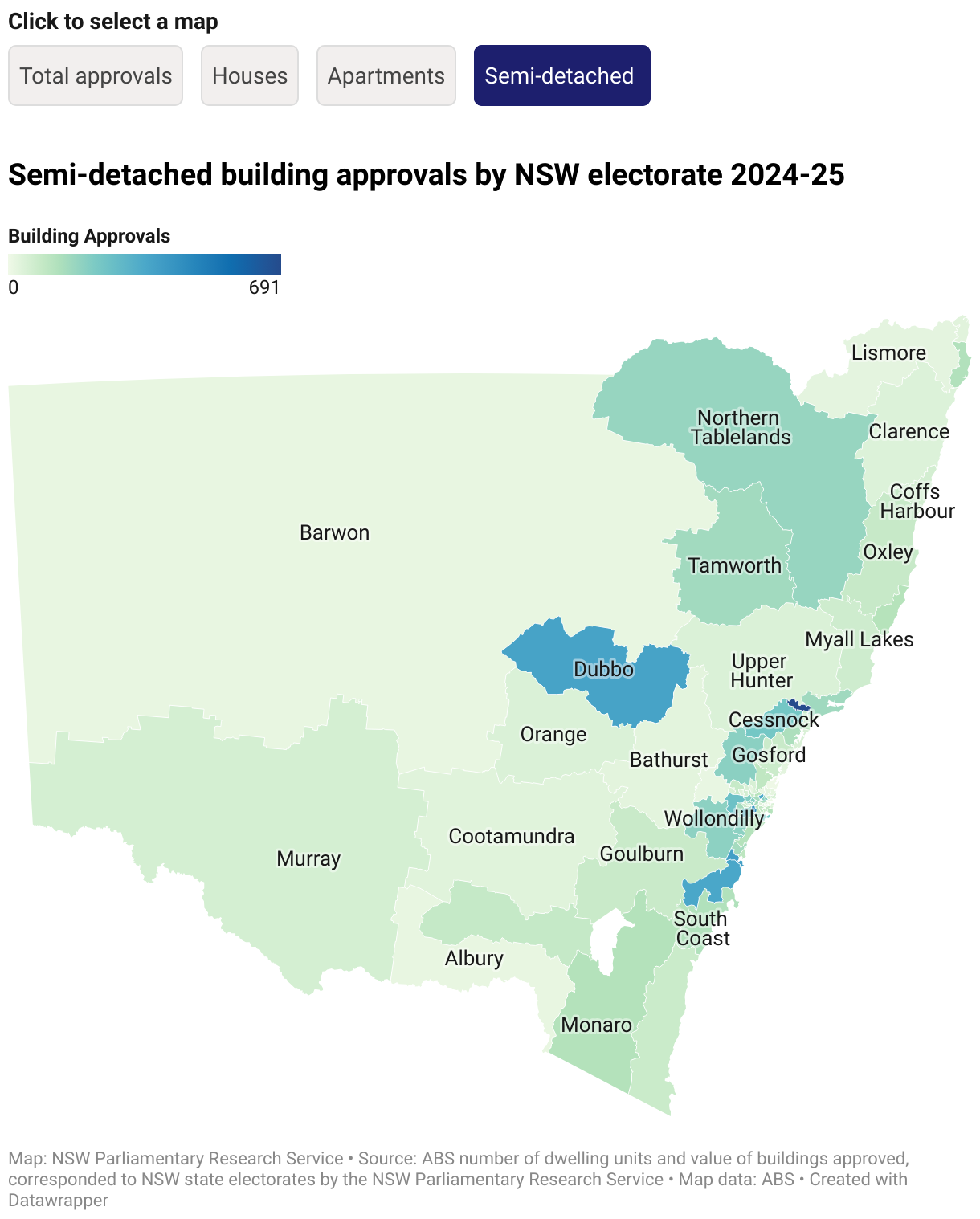 Click to select a map Total approvals Houses Apartments Semi-detached Semi-detached building approvals by NSW electorate 2024-25