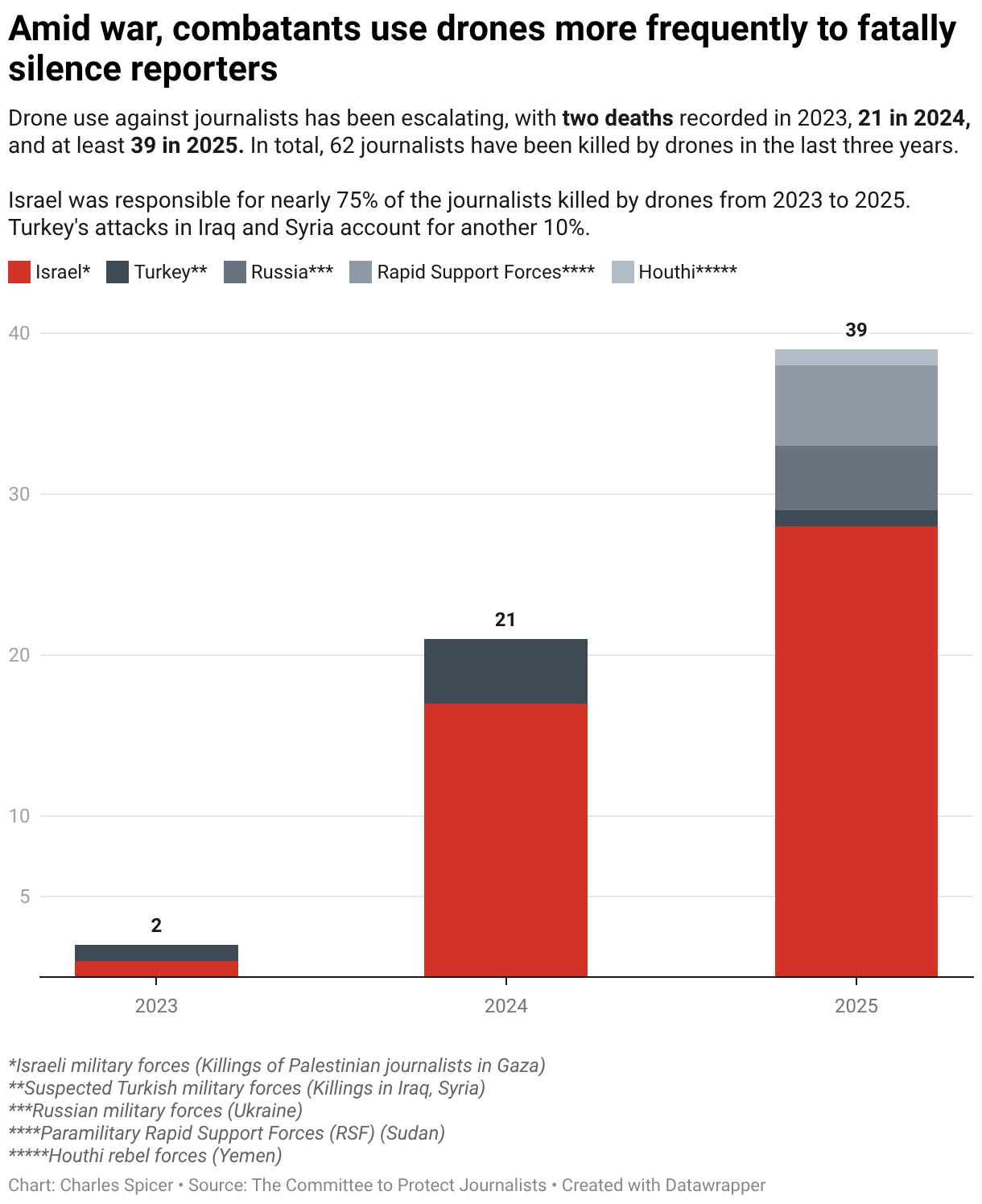 Drone use against journalists has been escalating, with two deaths recorded in 2023, 21 in 2024, and at least 39 in 2025. In total, 62 journalists have been killed by drones in the last three years.