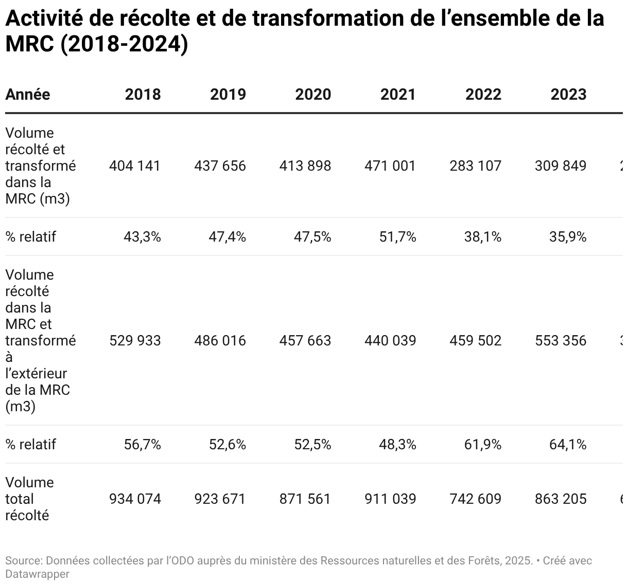 Activité de récolte et de transformation de l’ensemble de la MRC (2018-2024)