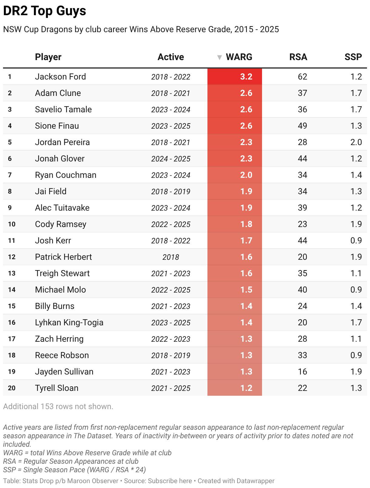 NSW Cup Dragons by club career Wins Above Reserve Grade, 2015 - 2025