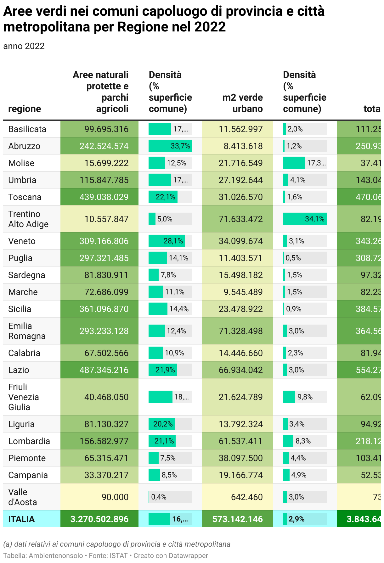 Aree verdi nei comuni capoluogo di provincia e città metropolitana per Regione nel 2022