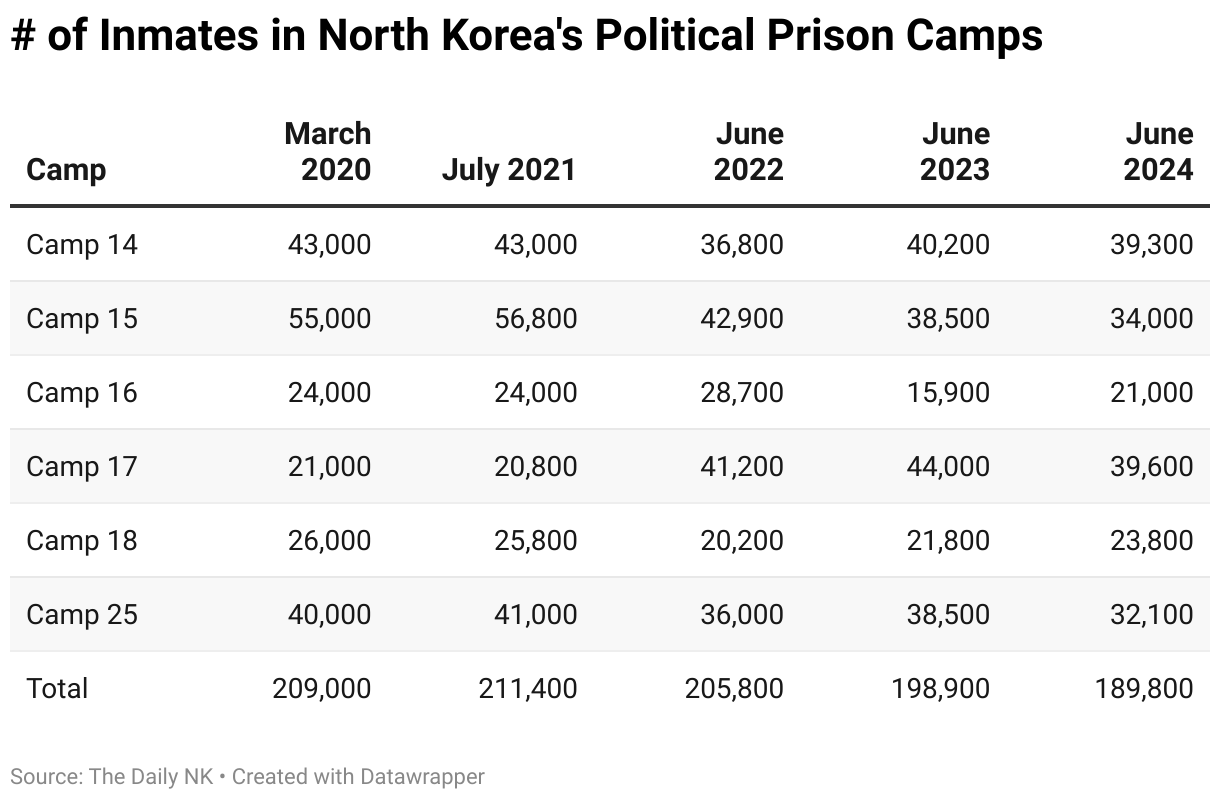 This table shows the number of inmates in North Korea's political prison camps from March 2020 to June 2024.