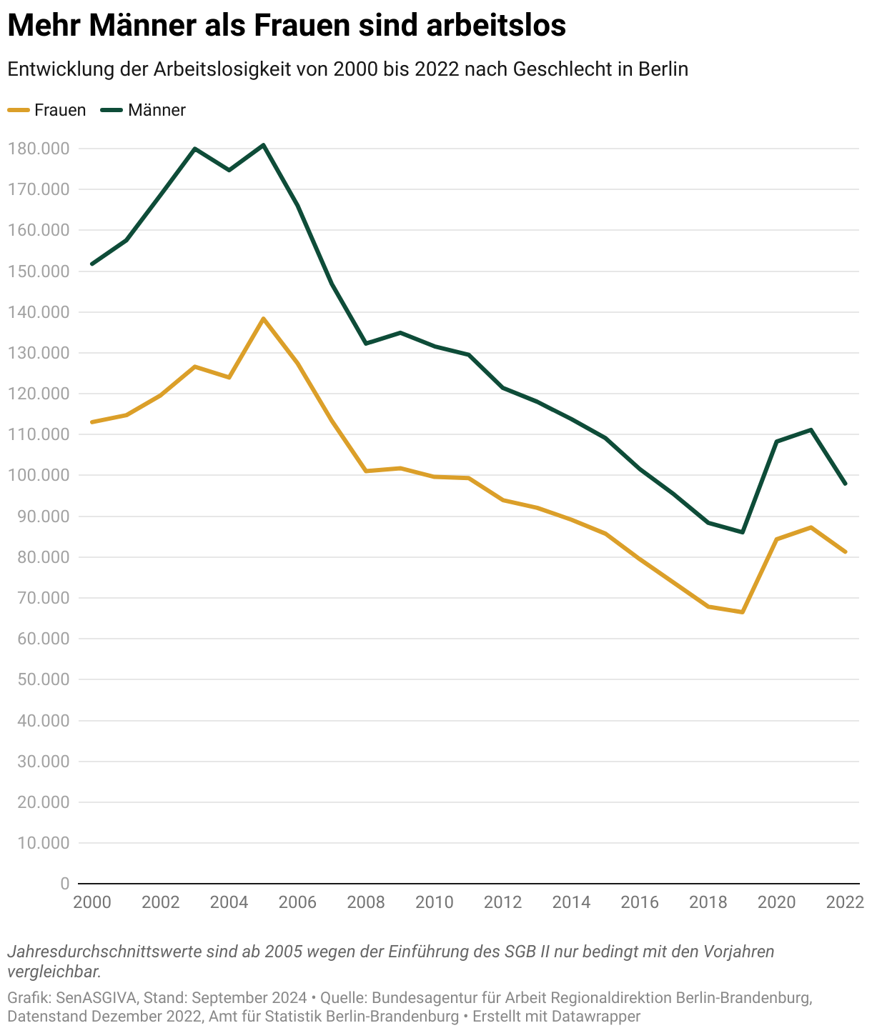 Von 2000 bis 2022 waren in jedem Jahr mehr Männer als Frauen arbeitslos.