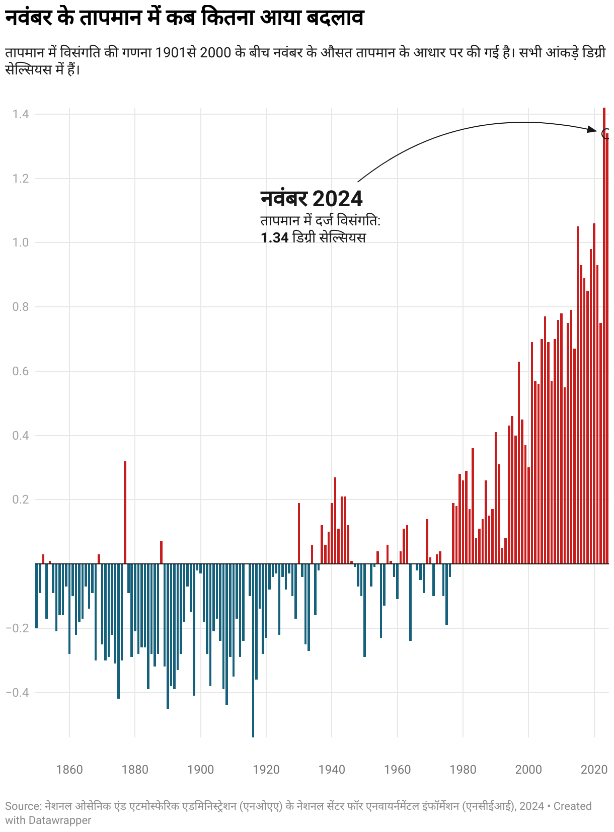 तापमान में विसंगति की गणना 1901से 2000 के बीच नवंबर के औसत तापमान के आधार पर की गई है। सभी आंकड़े डिग्री सेल्सियस में हैं।