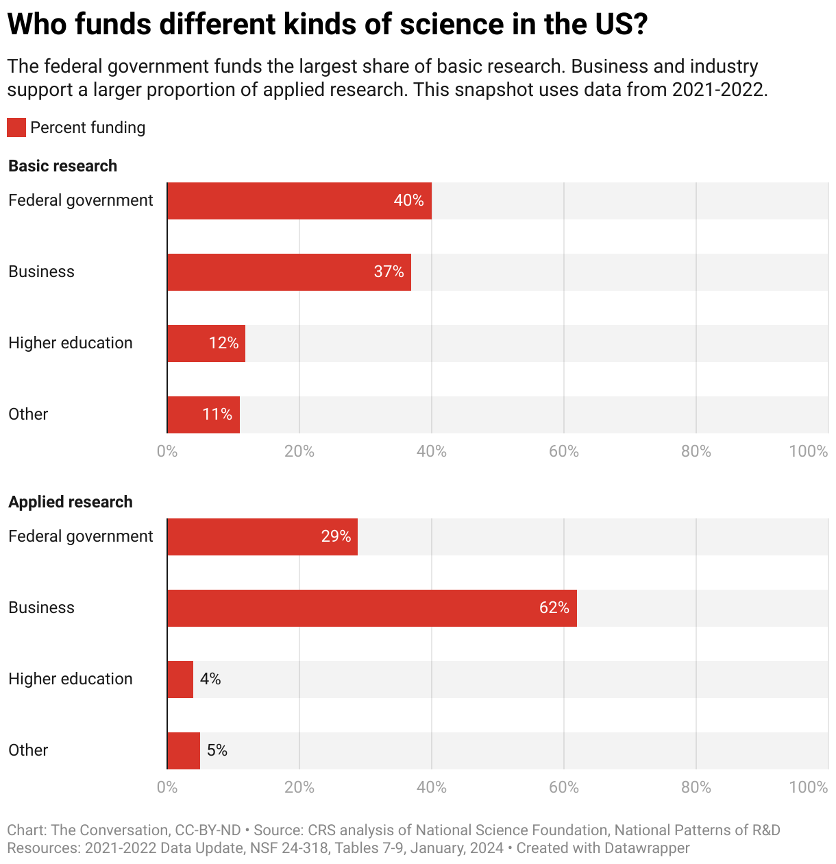 The federal government funds the largest share of basic research. Business and industry support a larger proportion of applied research. This snapshot uses data from 2021-2022.