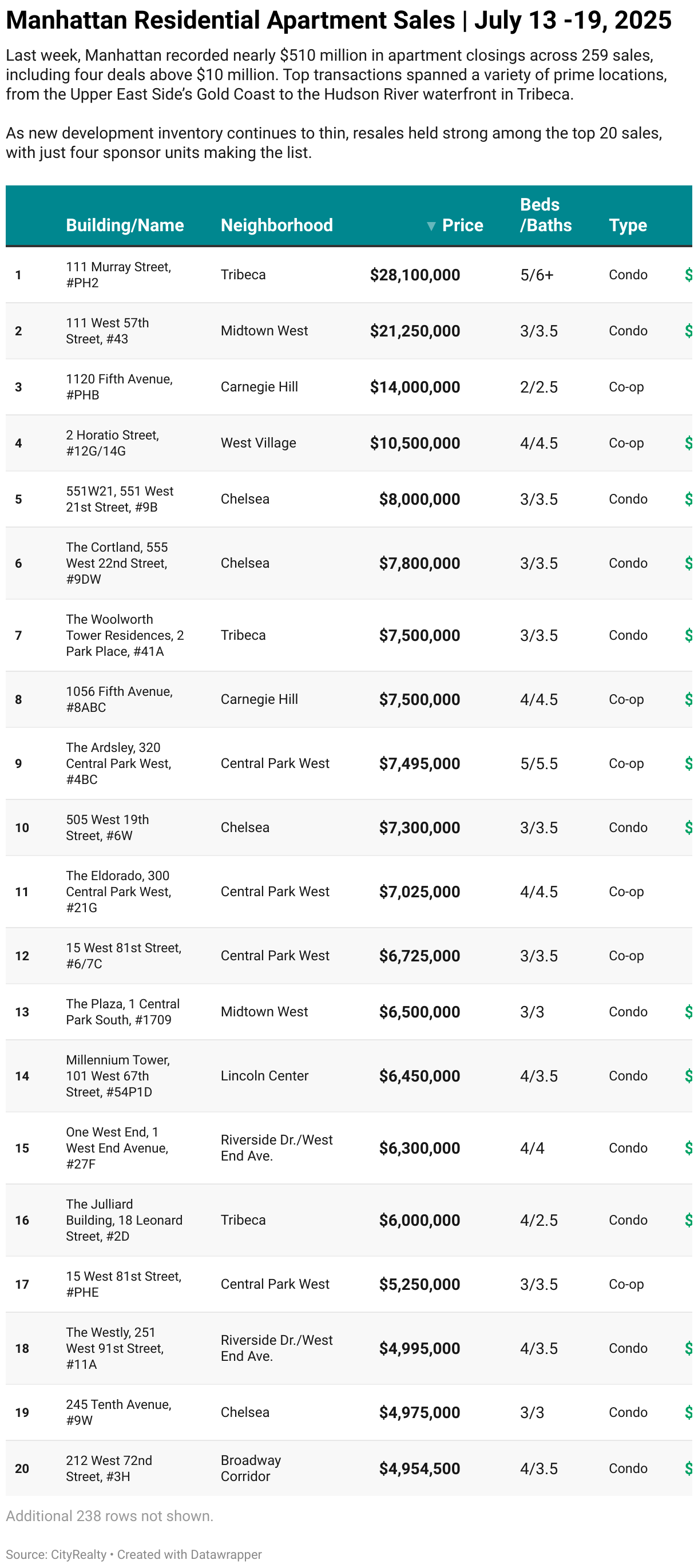 Last week, Manhattan recorded nearly $510 million in apartment closings across 259 sales, including four deals above $10 million. Top transactions spanned a variety of prime locations, from the Upper East Side’s Gold Coast to the Hudson River waterfront in Tribeca.