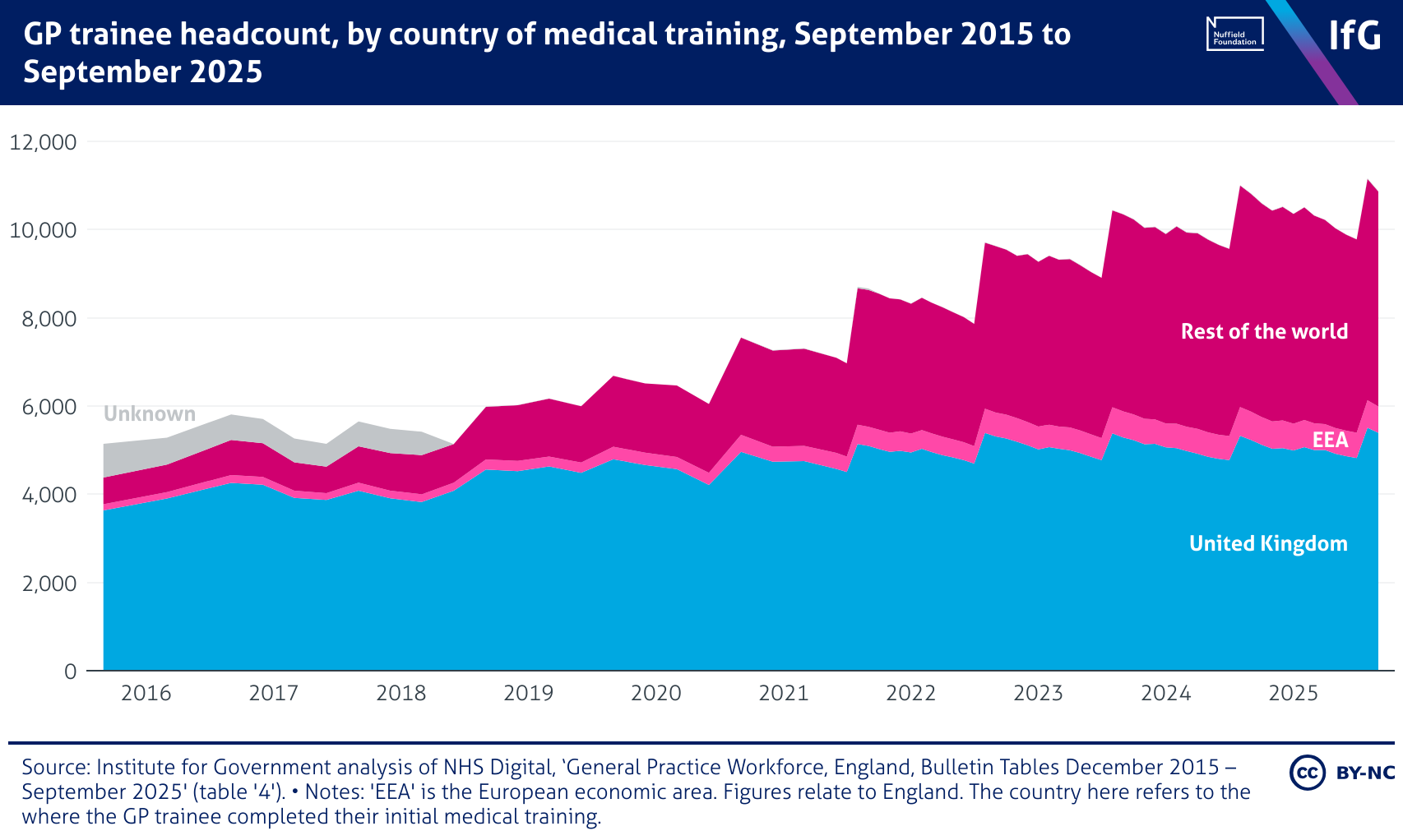 A stacked area chart from the Institute for Government showing GP trainee headcount, by country of medical training, September 2015 to September 2025, where the number of GP trainees more than doubles, rising from around 5,000 in 2015 to over 11,000 in 2025. Growth is largely driven by a rising number of trainees trained outside the UK, while the number trained in the UK rises more modestly.