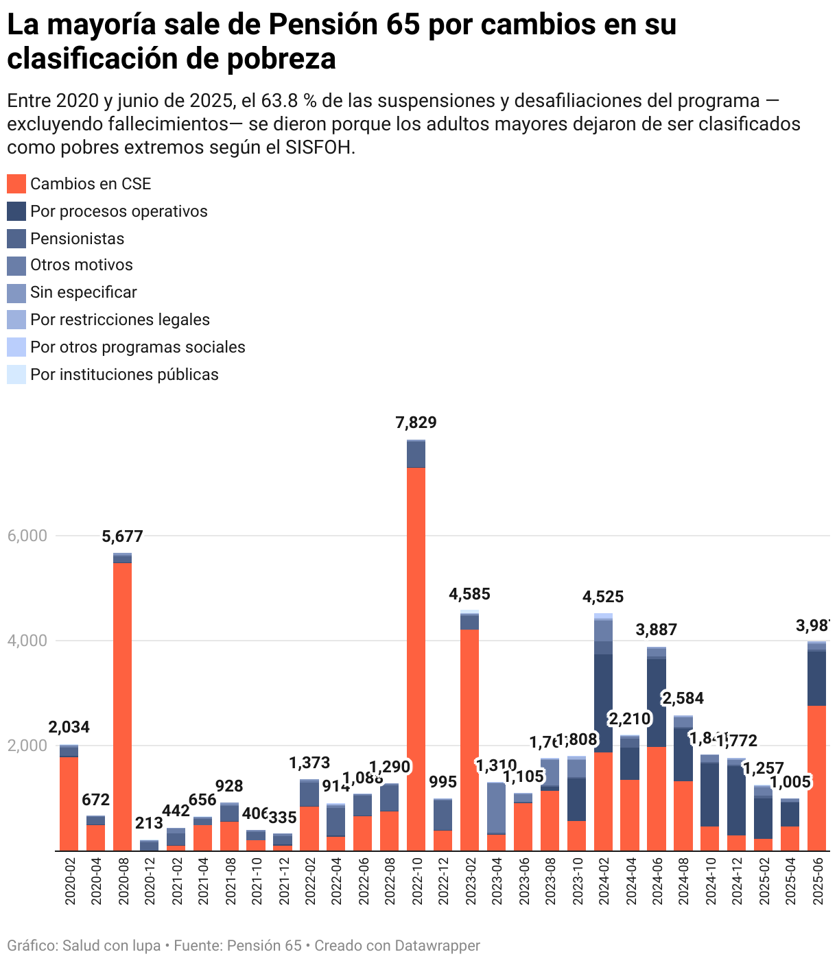Entre 2020 y junio de 2025, el 63.8 % de las suspensiones y desafiliaciones del programa —excluyendo fallecimientos— se dieron porque los adultos mayores dejaron de ser clasificados como pobres extremos según el SISFOH.