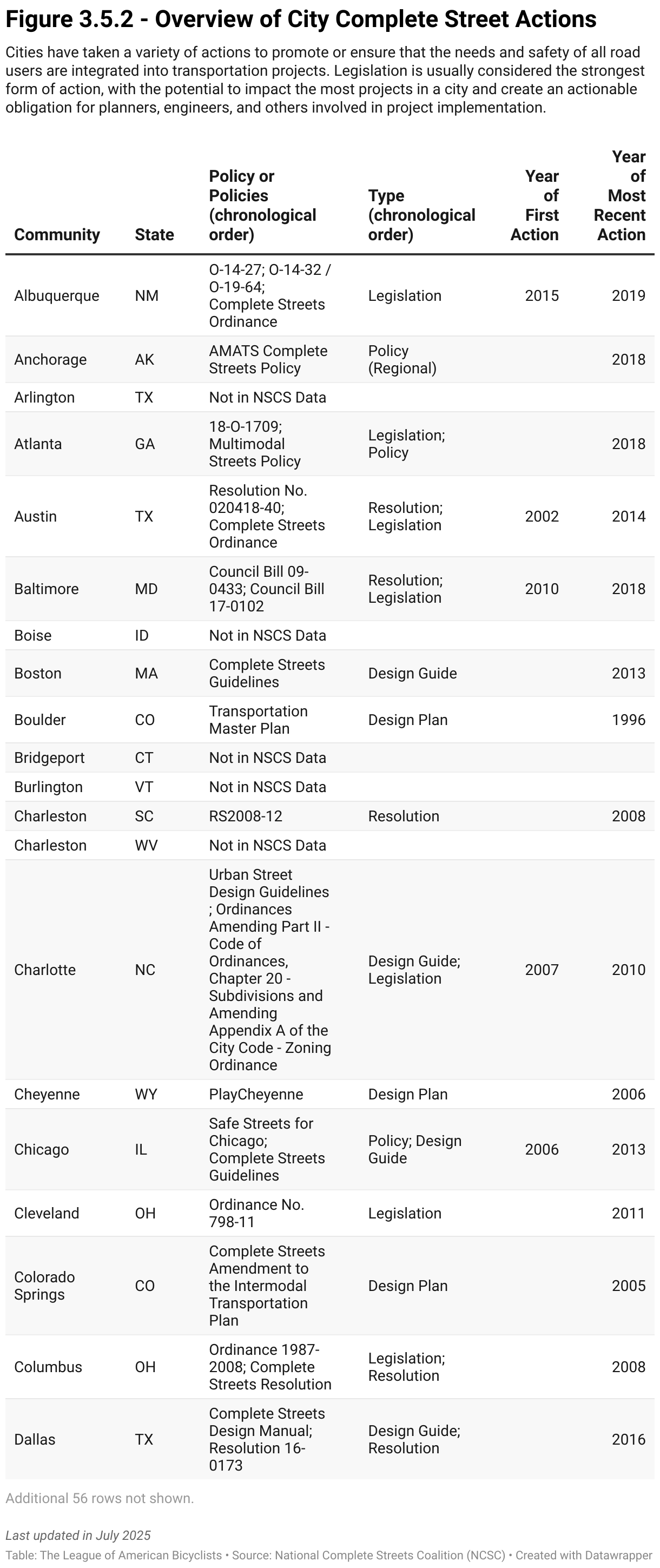 Cities have taken a variety of actions to promote or ensure that the needs and safety of all road users are integrated into transportation projects. Legislation is usually considered the strongest form of action, with the potential to impact the most projects in a city and create an actionable obligation for planners, engineers, and others involved in project implementation.