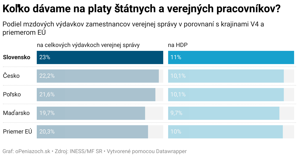 Podiel mzdových výdavkov zamestnancov verejnej správy v porovnaní s krajinami V4 a priemerom EÚ