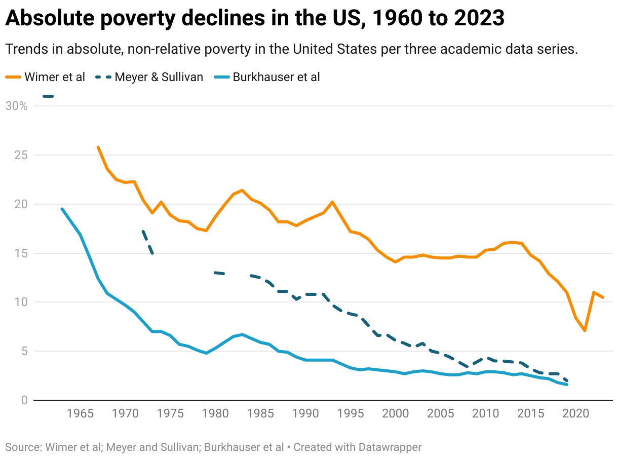 Trends in absolute, non-relative poverty in the United States per three academic data series.