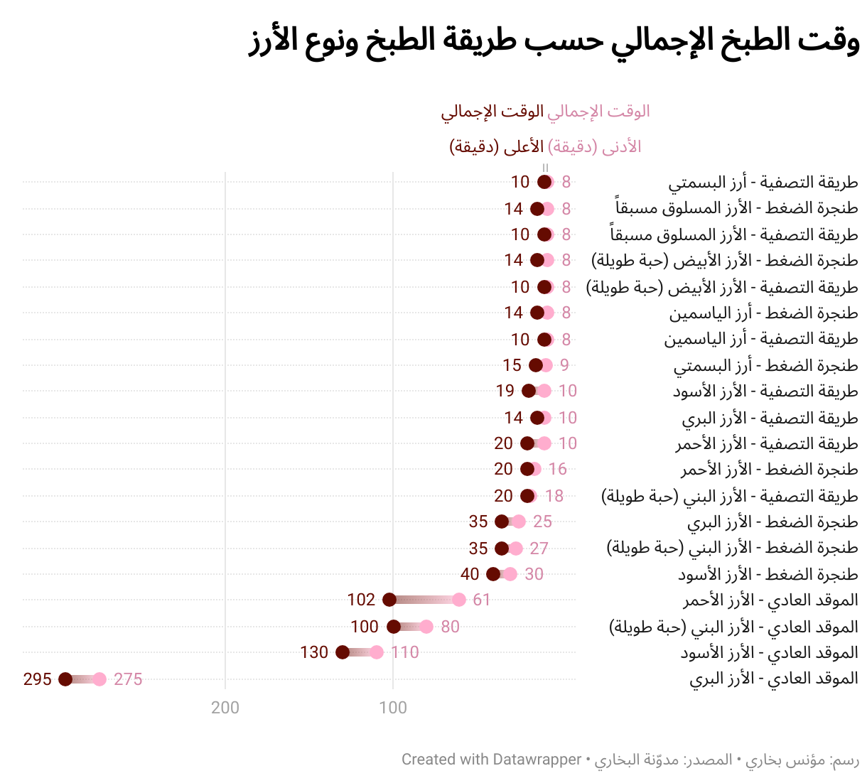 وقت الطبخ الإجمالي حسب طريقة الطبخ ونوع الأرز