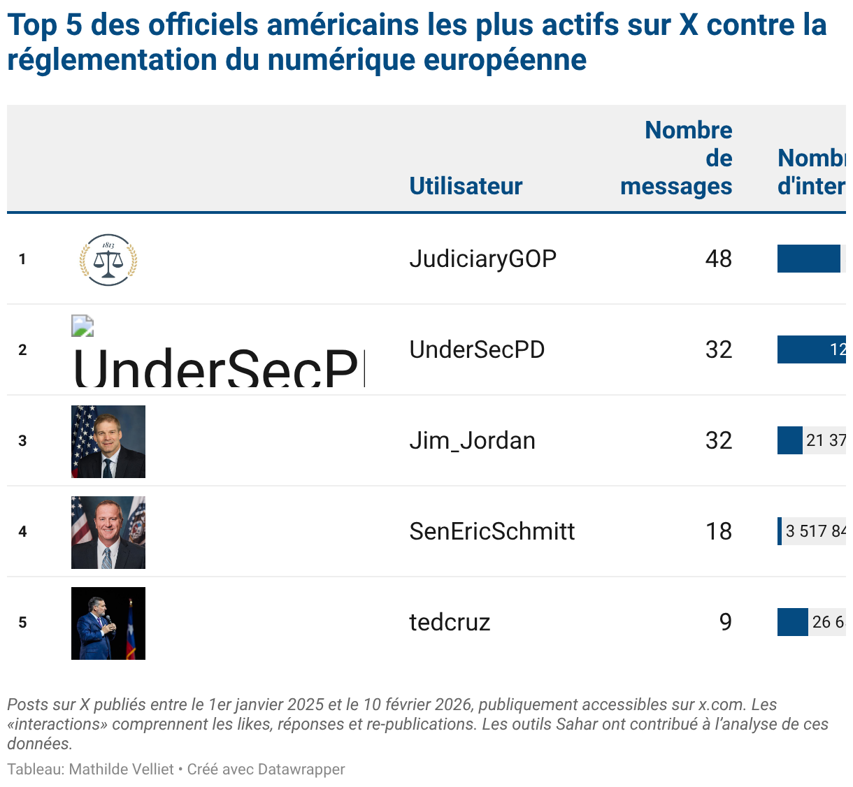 Top 5 des officiels américains les plus actifs sur X contre la réglementation du numérique européenne
