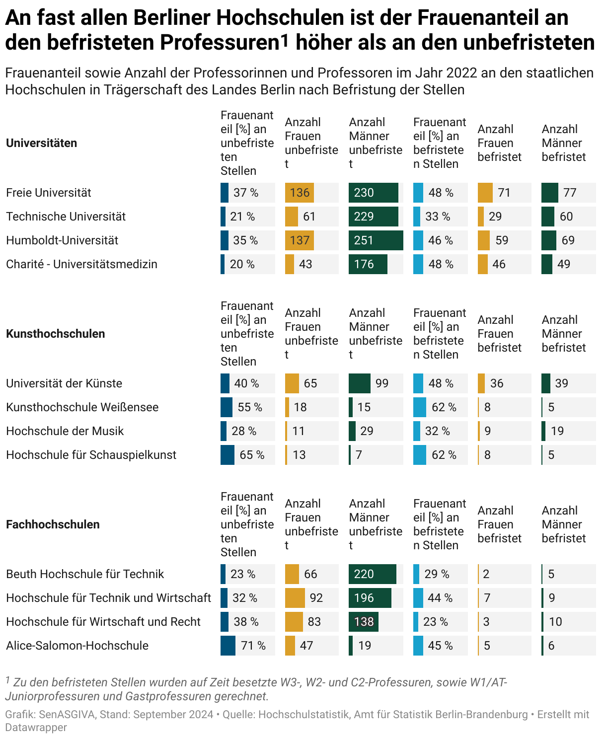 An nahezu allen Berliner Hochschulen ist der Frauenanteil bei den unbefristeten Stellen niedriger als bei den befristeten Stellen.