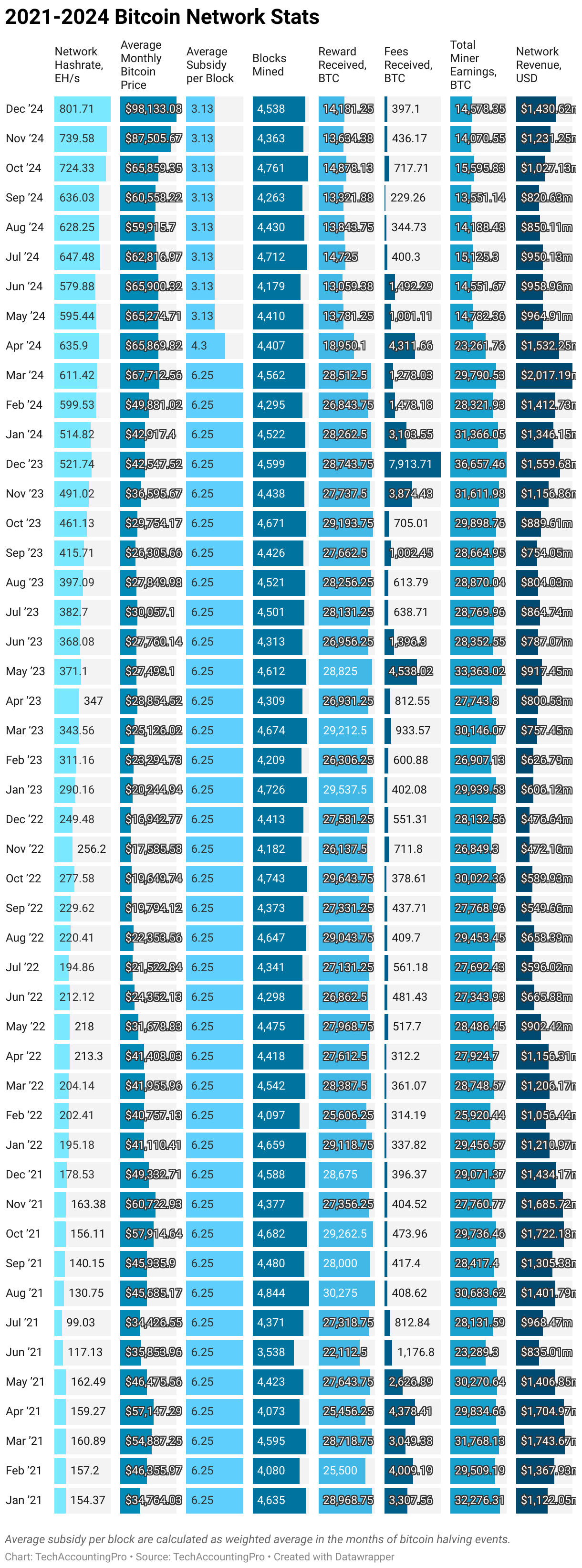 Hashrate, average monthly price, blocks mined, rewards earned by bitcoin miners globally from 2021 to 2024.