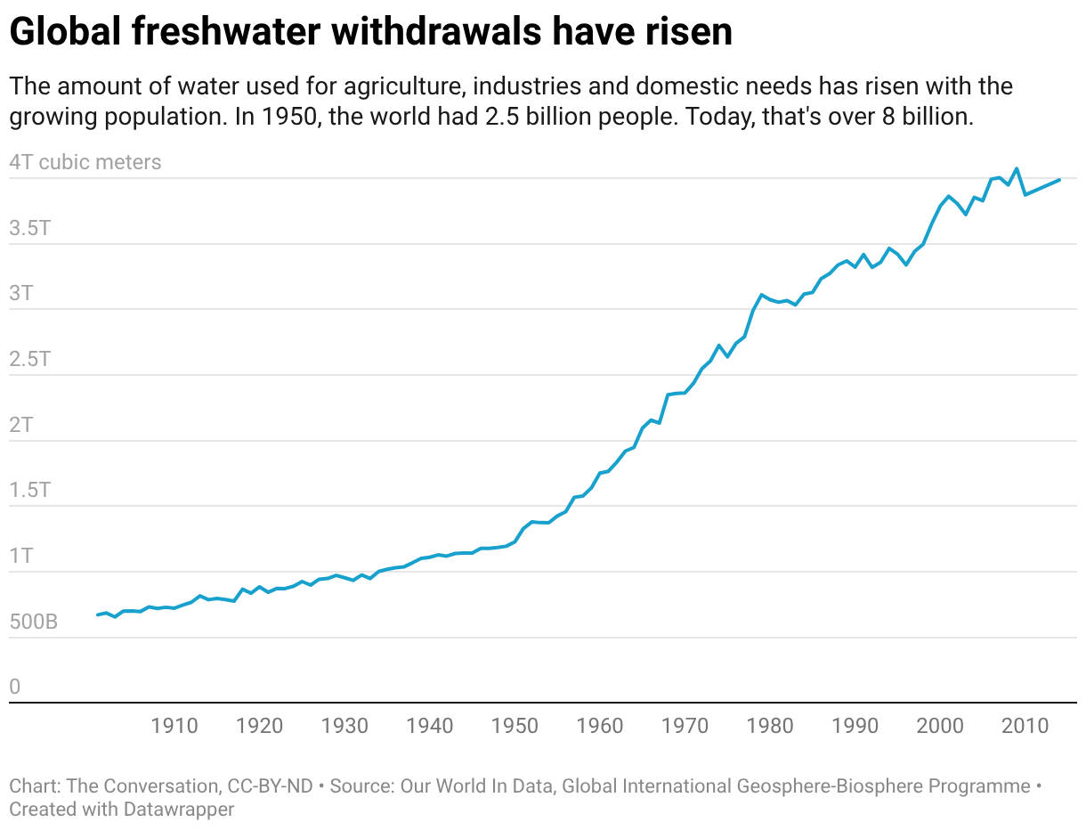 The amount of water used for agriculture, industries and domestic needs has risen with the growing population. In 1950, the world had 2.5 billion people. Today, that's over 8 billion.