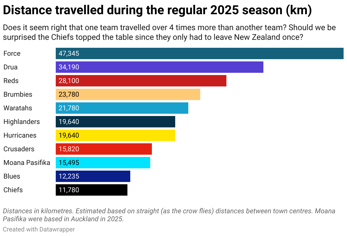 Does it seem right that one team travelled over 4 times more than another team? Should we be surprised the Chiefs topped the table since they only had to leave New Zealand once?