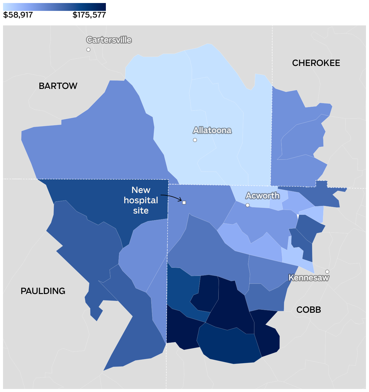 Wellstar's proposed Acworth hospital is within five miles of some of the wealthiest Census tracts in the state. Median household incomes near the site are as high as $175,000 in some areas.