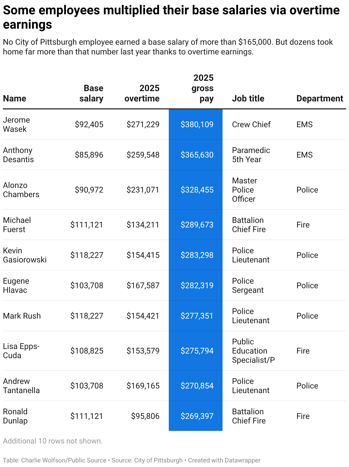 No City of Pittsburgh employee earned a base salary of more than $165,000. But dozens took home far more than that number last year thanks to overtime earnings.