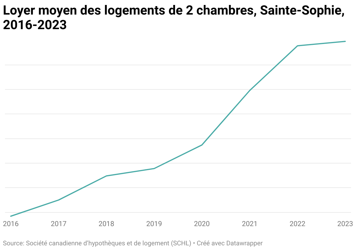 Loyer moyen des logements de 2 chambres, Sainte-Sophie, 2016-2023