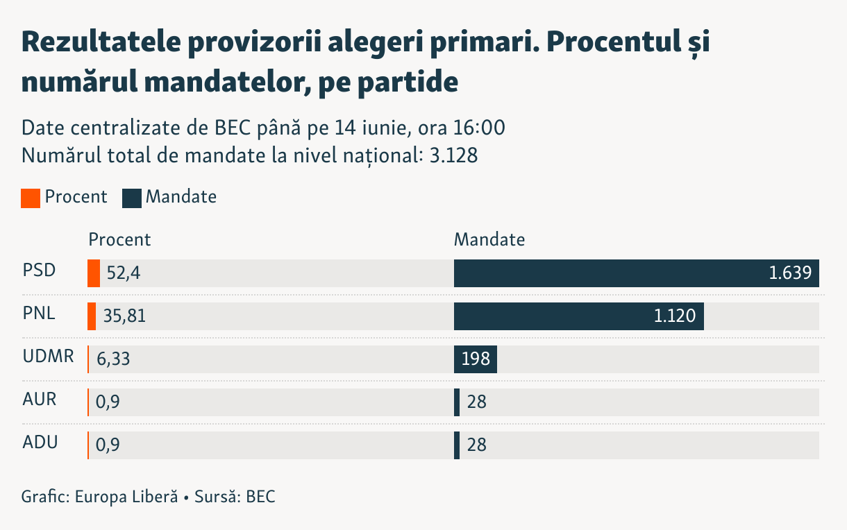 Date centralizate de BEC până pe 14 iunie, ora 16:00 Numărul total de mandate la nivel național: 3.128