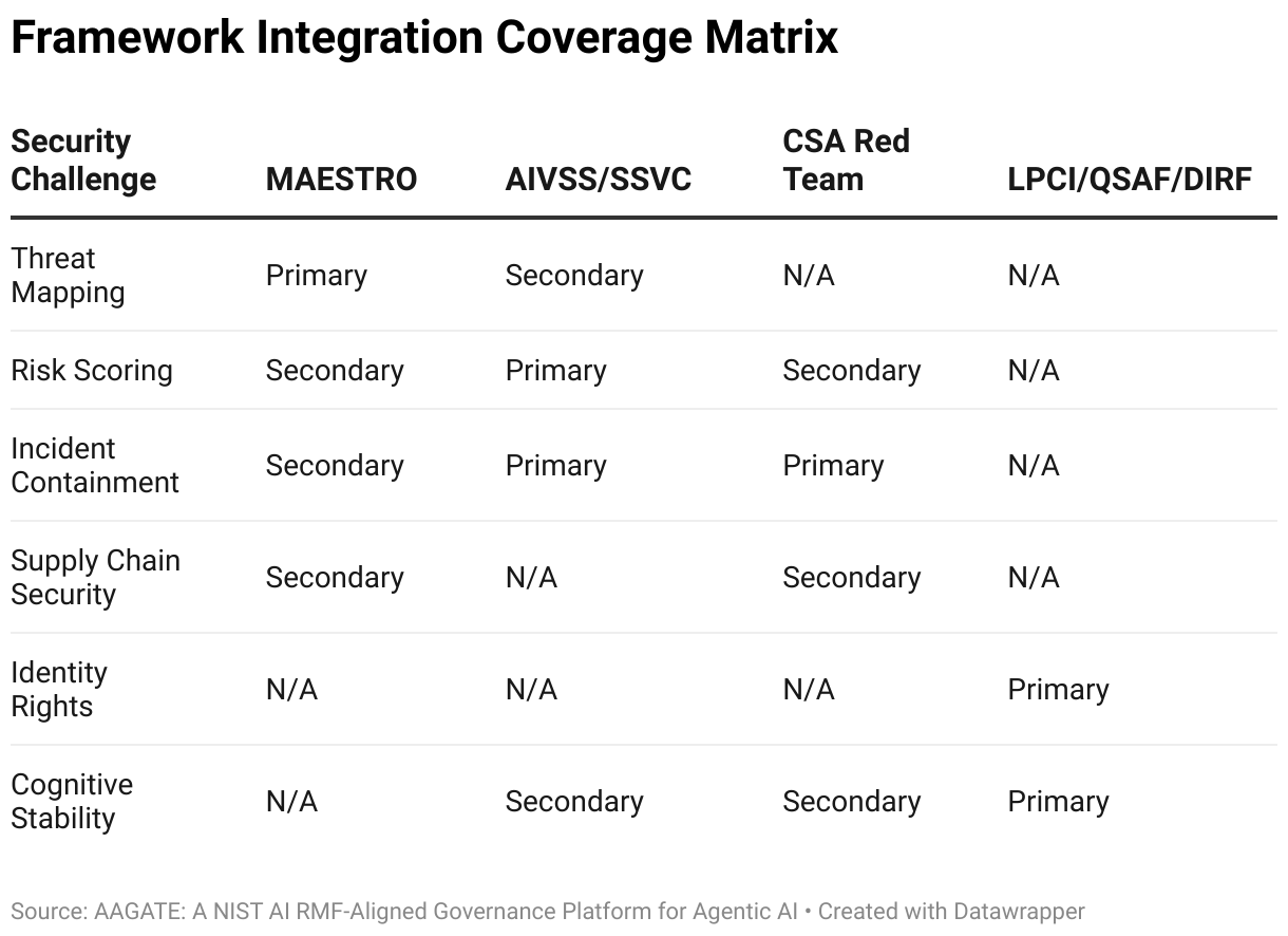 Table showing how MAESTRO, AIVSS/SSVC, CSA Red Teaming, and emerging frameworks address specific security challenges across the NIST AI RMF functions